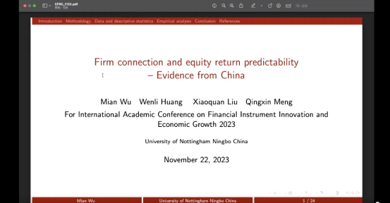 ued体育 与诺丁汉大学联合培养的吴冕博士做了题为“ Firm Connection, and Equity Return Predictability-Evidence from China”的主旨报告,分享了有关基于图的机器学习方法构建公司关联关系网络的方法。