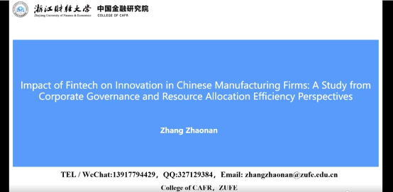 ued体育 的张曌囡老师做了题为“ Impact of Fintech on Innovation in Chinese Manufacturing Firms-A Study from Corporate Governance and Resource Allocation Efficiency Perspectives”的主旨报告,探讨了金融科技对中国制造业的影响研究。