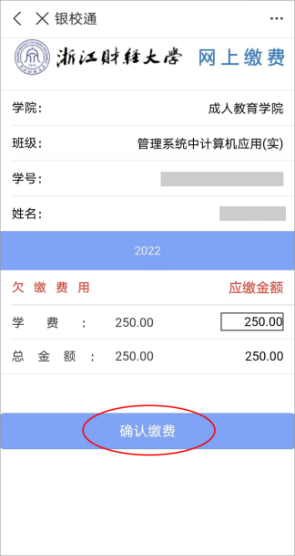 3.学生请在学号栏输入考核课程代码+准考证号(如某同学报会计专科毕业设计,代码为:10217加上本人的准考证号12位,共需填写17位号码。如需考两门或以上,不同课程要分别缴款),在姓名栏内输入姓名,点击“查询”,核对个人信息和缴费信息,点击“确认缴费”进行缴纳。待来校报到时,凭缴费信息换取正式学费收据。