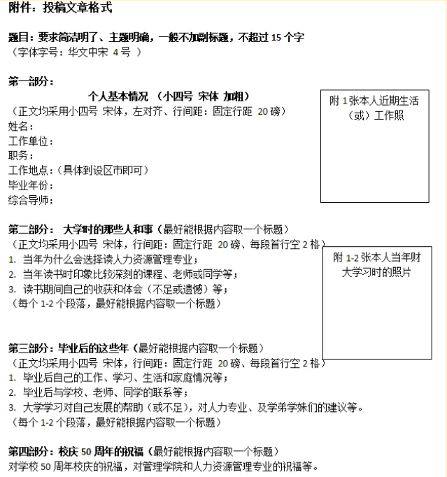 今年恰逢学校50周年校庆,为进一步提升人力资源管理专业人才培养质量,现收集2004年-2024年毕业的100位校友的成长记录,了解校友当年在校读书及毕业后发展情况,对人力资源管理专业建设的意见建议,及对学校50周年的祝福等,搜集完毕后将编辑成册《校友-学校携手共育“浙财金生”》--100位人力资源管理专业校友对学校50周年的祝福(暂定名)。