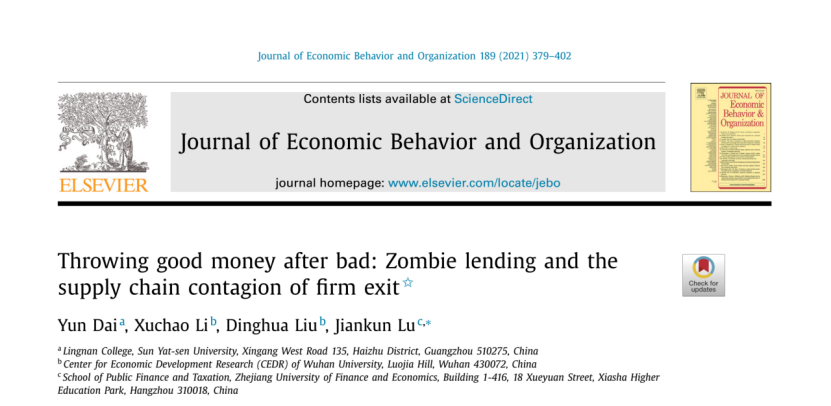 近日,ued体育 财政税务学院副教授鲁建坤,与中山大学岭南学院戴芸副教授、武汉大学经管学院李旭超副教授以及博士生刘丁华合作的论文《Throwing good money after bad: Zombie lending and the supply chain contagion of firm exit》在经济学国际顶尖学术期刊《Journal of Economic Behaviorand Organization》发表。