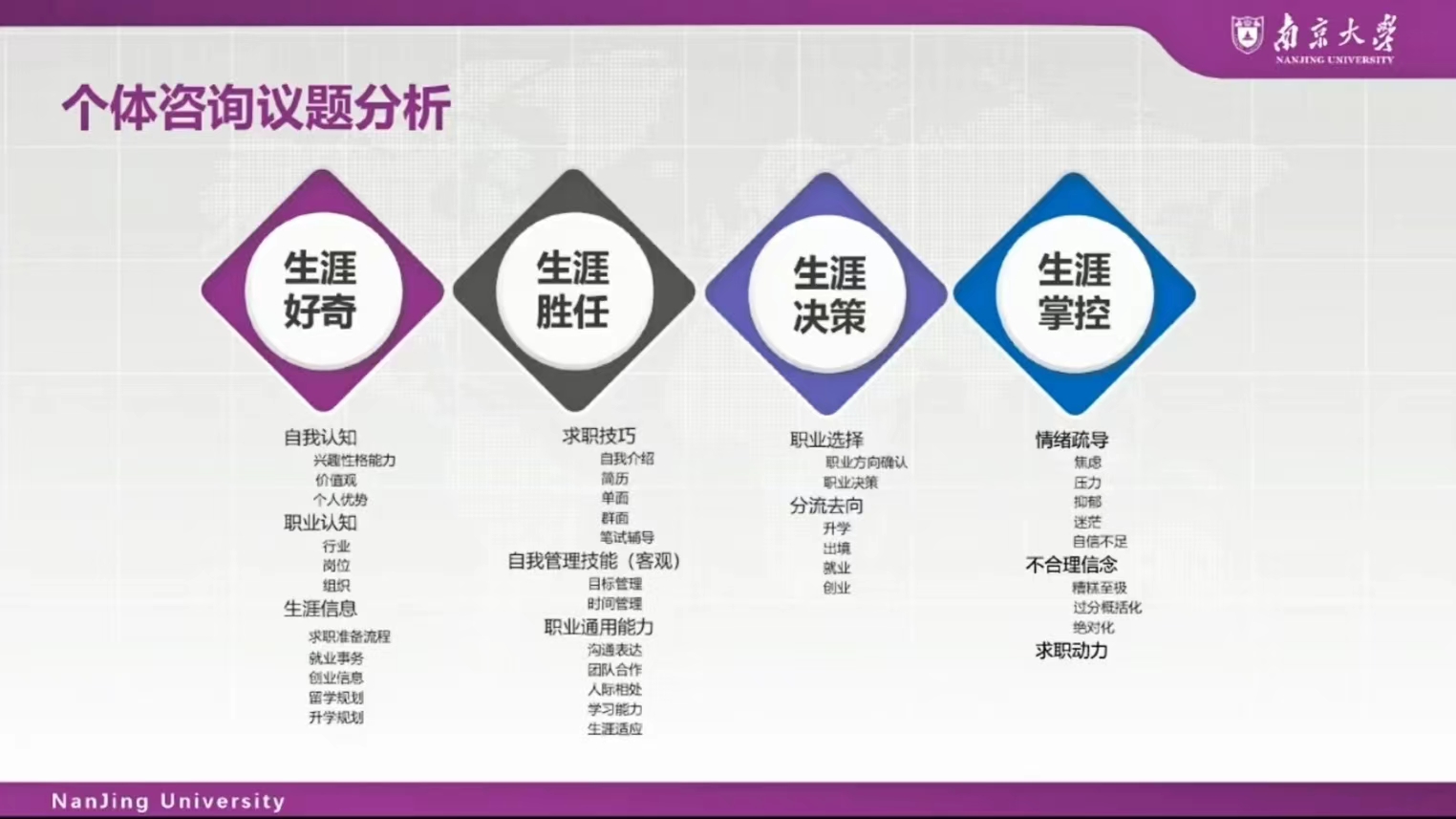 随着时代环境的变化,生涯教育对于学生个人发展的作用更加凸显,也愈发受到学校、社会、政府的重视。南京大学学生就业指导中心主任刘慧作为特邀嘉宾在直播中也提到了这点,并分享了相关的教学经验。刘老师从大学生生涯困惑议题、就业指导教学模式探析、教学实践与案例分享、典型案例与咨询策略和咨询师的个人成长五个方面提供了关于解决大学生生涯困惑的具体思路及可行措施。