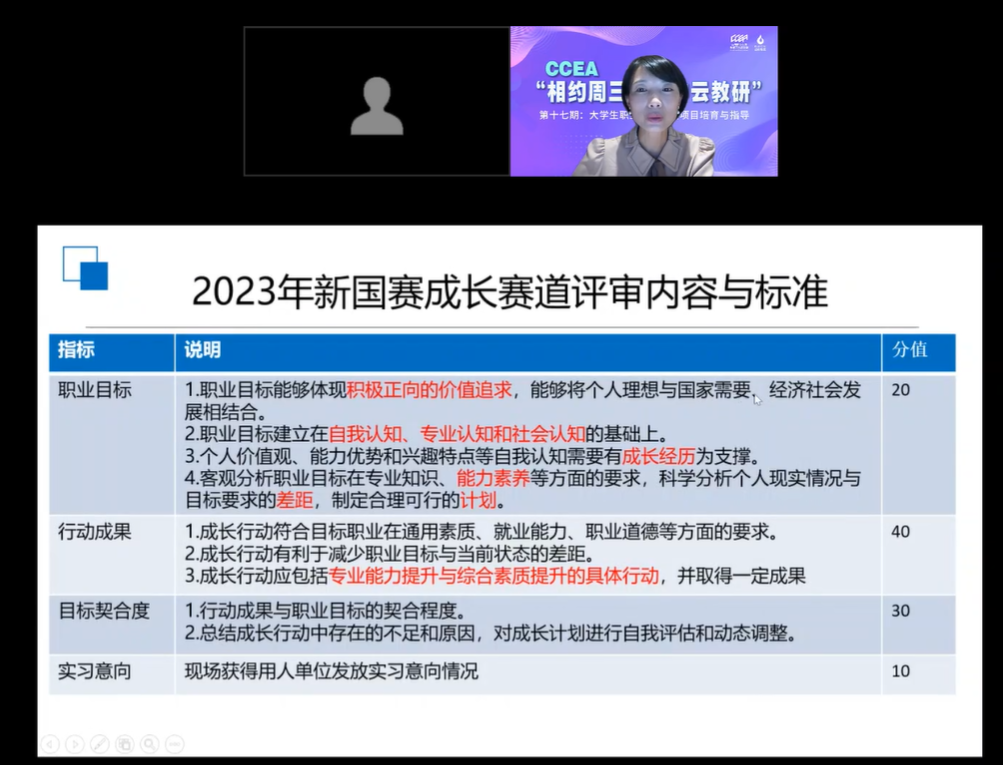 10月25日,由中国职业生涯教育工作者联盟主办、ued体育 创业学院承办的CCEA“相约周三·空中云教研”第十七期——大学生职业规划大赛项目培育与指导在线上成功举办。福州大学副教授阮娟受邀出席讲座。