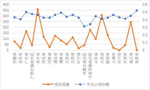 自2019年光伏新政下发以来,各地已经陆续公布了竞价项目申报时间表。新政规定,除了户用和扶贫项目外,2019年新建分布式和普通地面电站项目均实行竞价上网,国家能源局根据修正后的申报上网电价报价由低到高排序遴选纳入补贴范围的项目。目前,根据发改委公布的申报名单,截至2020年8月,共计申报4340竞价上网项目。对比2019年和2020年的价格数据,可以看到2019年光伏上网电价最高为0.521元/度、最低为0.313元/度,2020年最高电价为0.441元/度、最低电价为0.266元/度,平均下降约0.1元/度。从新增光伏项目规模看,2019年前3名分别为广西、山西和浙江,2020年河北和宁夏光伏新增项目激增,一度超越浙江省,分居第二、三位。