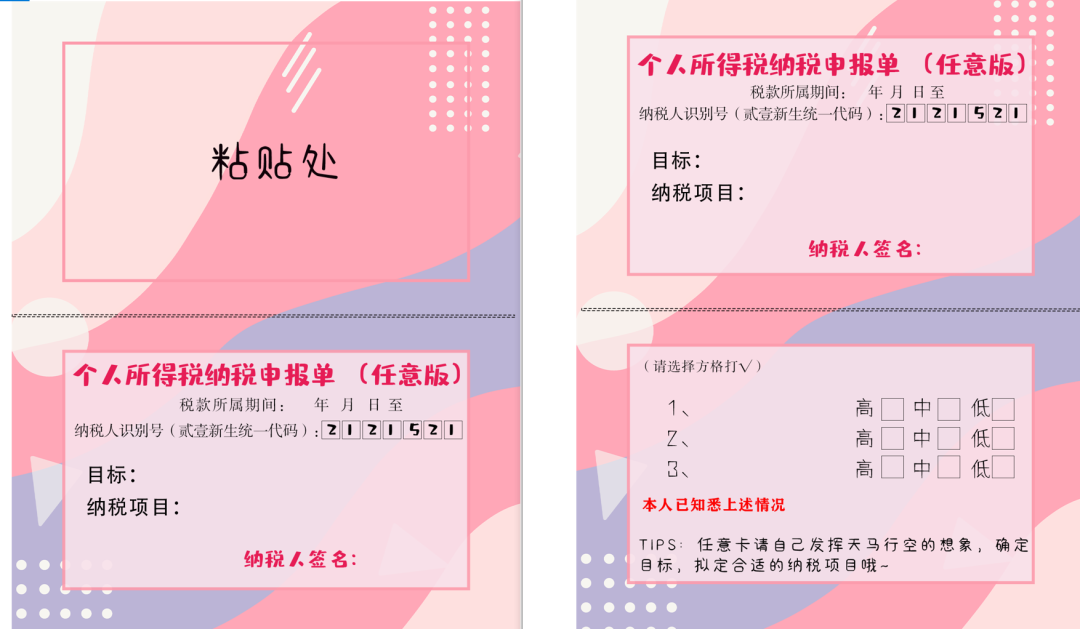 根据学校疫情防控工作要求,今年学院共设置了桃李苑、成蹊苑两个报到点。迎新现场,学院结合专业特色,为新生设计并发放专属纳税申报纪念卡。在志愿者的引导下,新生们在卡片上写下自己的四年目标,自主选择为目标上交相应的时间税、志愿税、学业税等,并拼贴组成“财税有你”的字样,借此培养新生们时间管理意识与目标执行力。