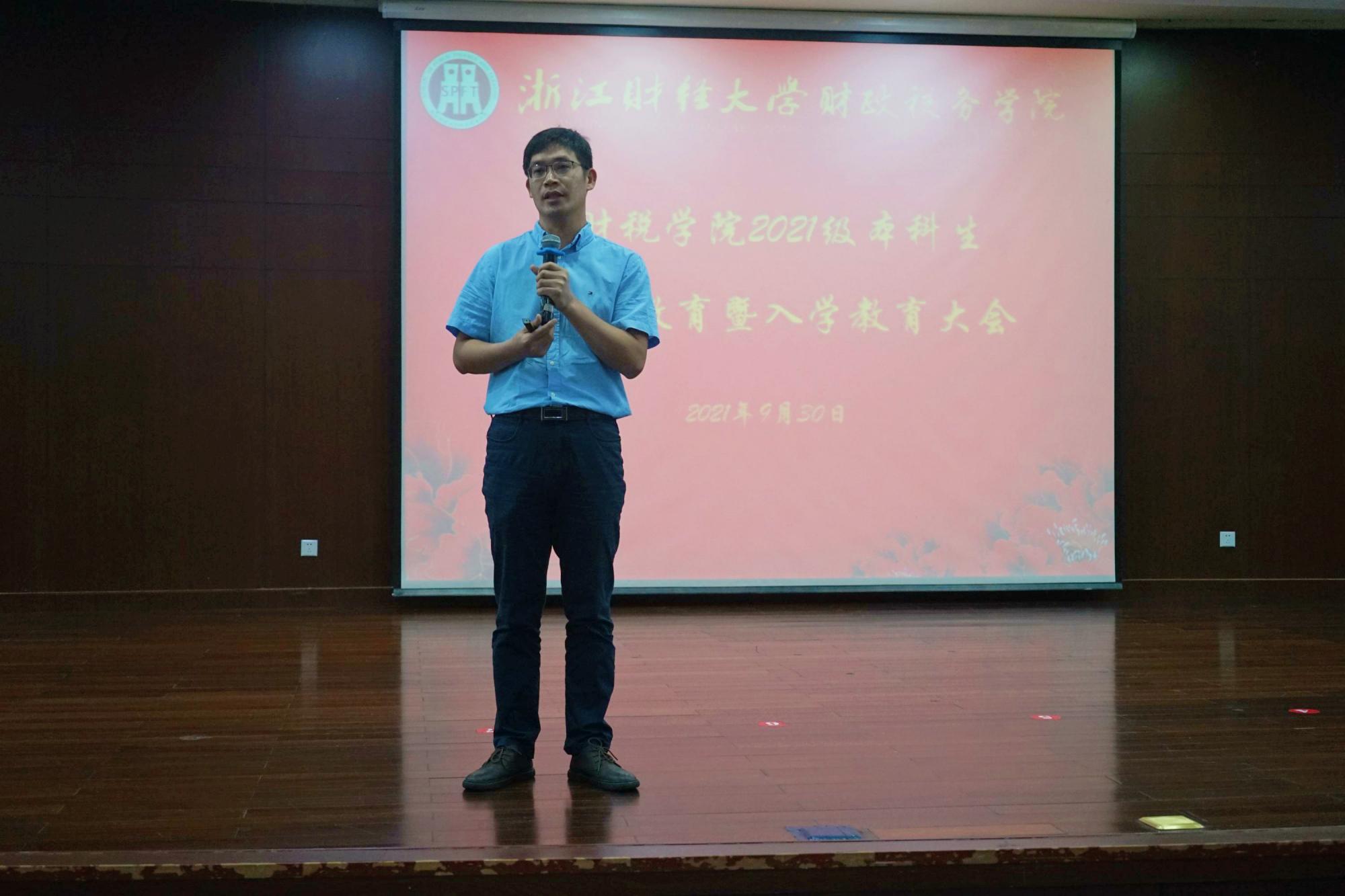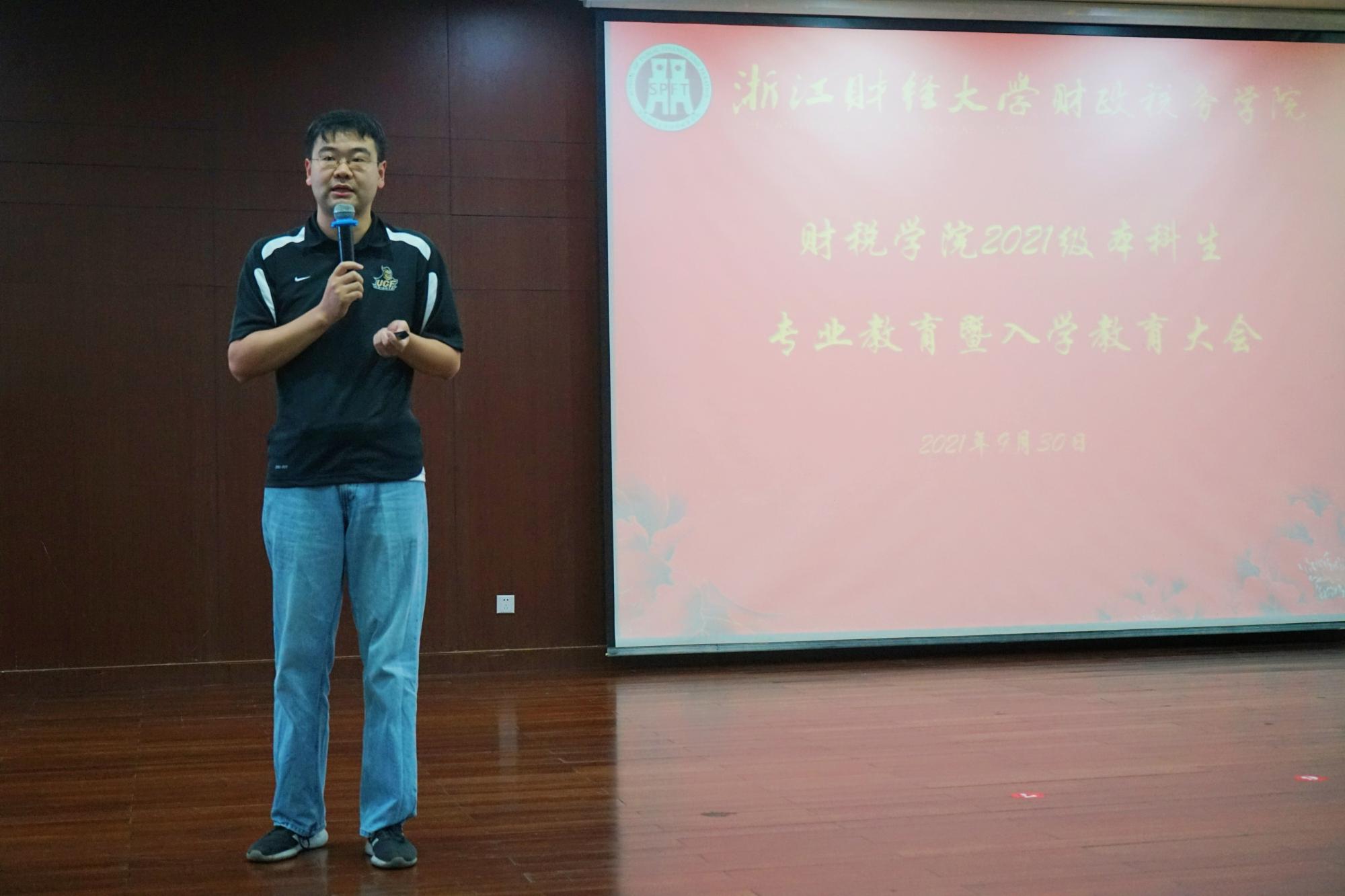 9月30日下午,财政税务学院2021级本科生专业教育大会在学术第一报告厅召开。院长司言武、党委书记童玉玲、党委副书记徐丽玲、科研副院长高琳、各系正副主任、2021级各班班主任及全体2021级新生参加。本次大会由教学副院长童光辉主持。