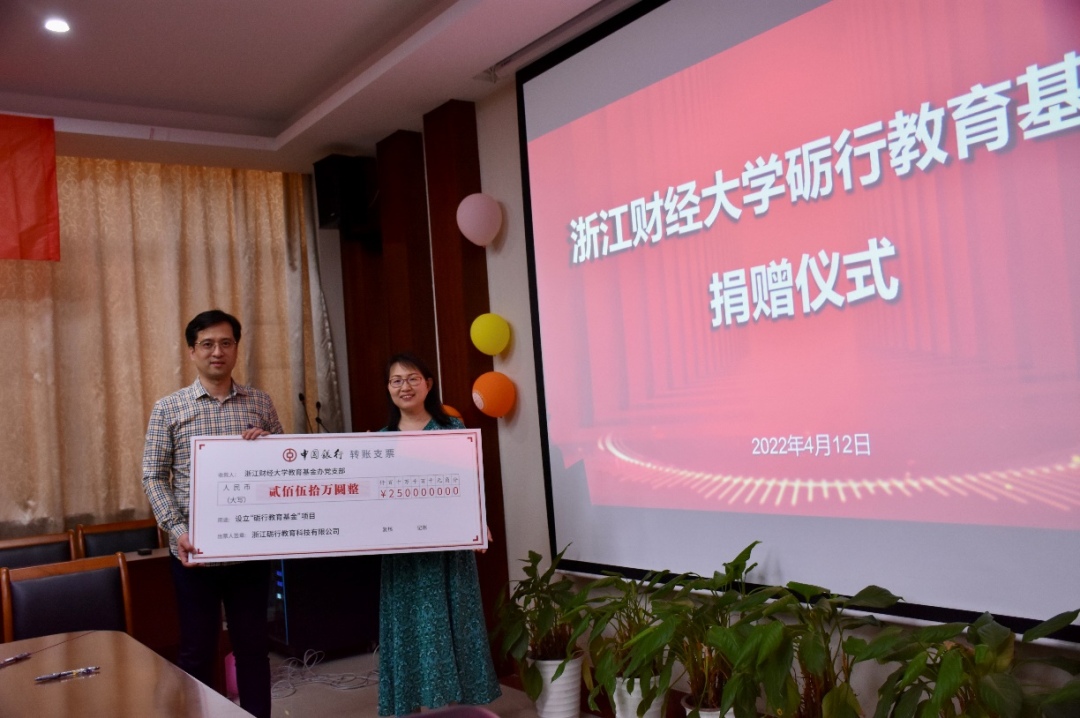4月12日下午,由浙江砺行教育科技有限公司(以下简称“砺行教育”)捐资设立的“砺行教育基金”捐赠签约仪式在数据科学学院402会议室举行。ued体育 副校长徐晓东、砺行教育杭州总校校长章浩、校社会合作办和校友办主任张红英、计划财务处副处长张稀、数据科学学院院长洪兴建、副院长周银香、李杰,院党委副书记何露霞、院社会合作办主任林振洪等出席捐赠仪式。