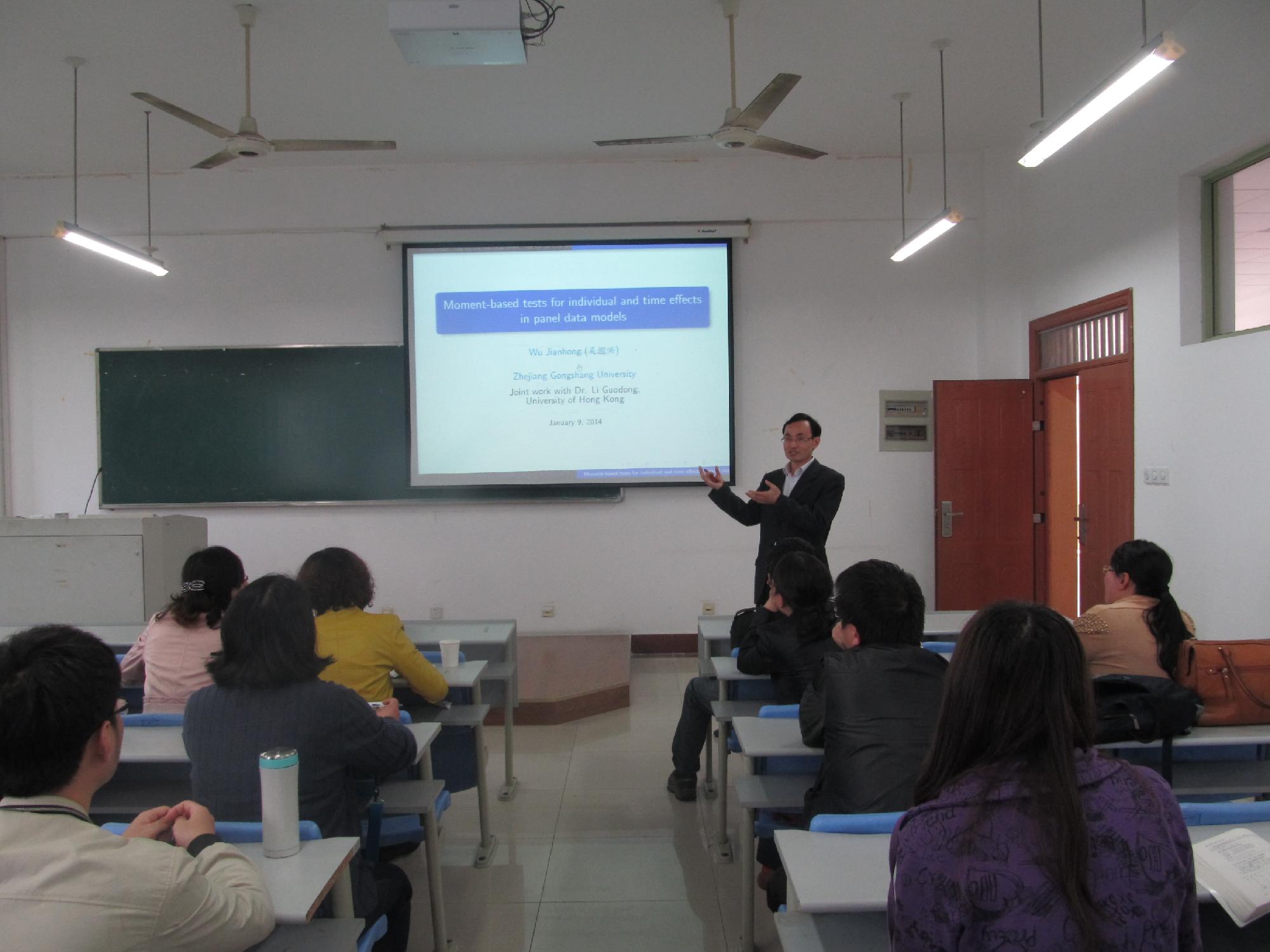2014年4月22日下午,浙江工商大学吴鑑洪教授应邀来我校讲学,做了题为“Moment-based tests for individual and time effects in panel data models”的报告。数统学院全体研究生及部分老师参加了此次讲座。报告会由我院赵晓兵教授主持。