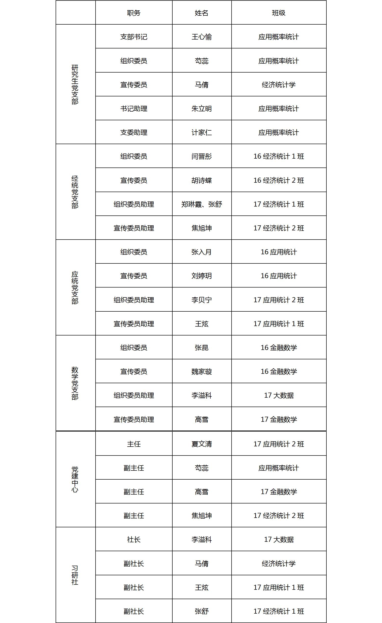 经ued体育 数据科学学院各学生党支部表决通过,推选出新一届学生党支部支委。经学院党委研究决定,委任新一届学生党建中心、习研社负责人。现将名单公示如下: