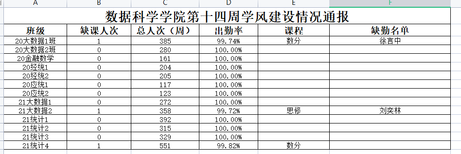 为进一步培育优良学风,构建我院学风建设的长效机制,营造良好的学习氛围,推进内涵建设,构建优良院风,学院对所有大一、大二班级统一上的课程及晚自习进行了课前全覆盖点名。现将点名情况做如下通报。