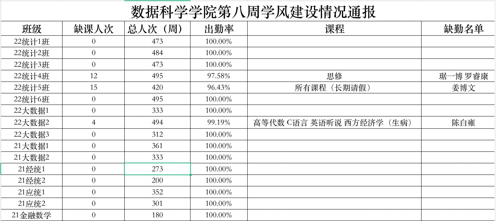 为进一步培育优良学风,构建我院学风建设的长效机制,营造良好的学习氛围,推进内涵建设,构建优良院风,学院对所有大一、大二班级统一上的课程及晚自习进行了课前全覆盖点名。现将点名情况做如下通报。