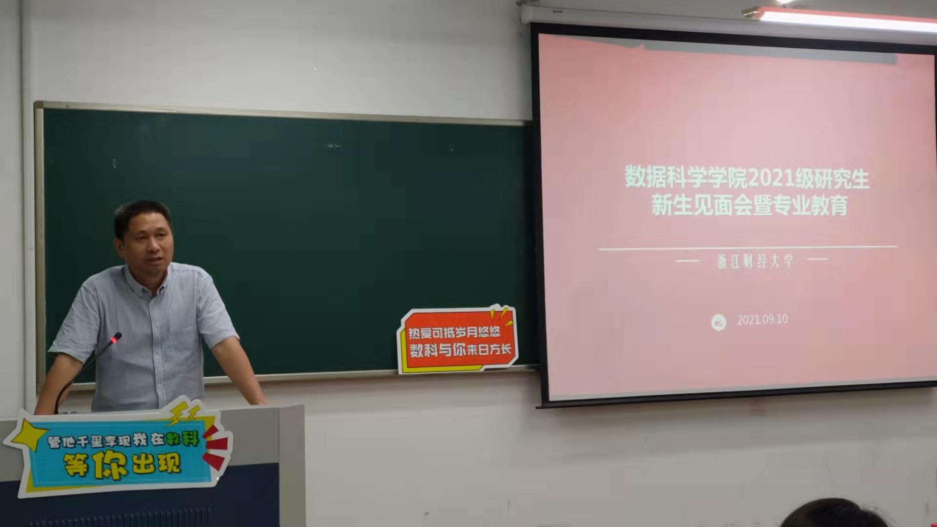 9月10日上午,数据科学学院2021级研究生新生见面会暨专业教育会在6号楼109教室举行,院长洪兴建、党委书记段雪辉、副院长周银香、导师代表、科研办主任、学办主任、研究生辅导员以及全体21级硕士、博士研究生出席本次大会。