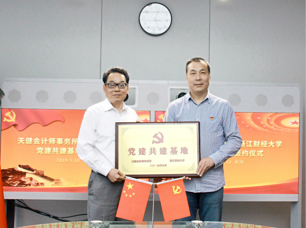 本网讯5月10日,学校与天健会计师事务所举行党建共建基地签约仪式。校党委书记李金昌,党委副书记卢新波,全国人大代表、天健会计师事务所党委书记、首席合伙人胡少先,天健管委会委员、副总裁王国海,天健副总裁、财务总监傅芳芳,天健党委副书记、副主任会计师吴杰等出席仪式。