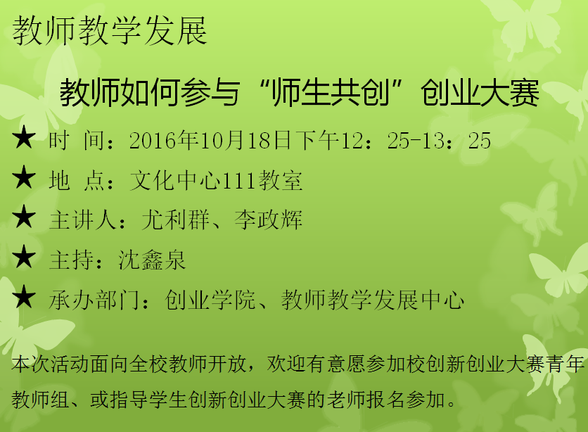 “教师教学发展”系列活动预告——教师如何参与“师生共创”创业大赛 发布时间:2016-10-14点击量:次 参加青年教师助讲培养的教师可将活动参加情况记录在培养档案。 报名链接:http://jwcold.zufe.edu.cn/soft/baoming/index.asp?eventid=201617 报名联系人:翁舟峰;电话:87557059(88059) 上一条:“教师教学发展”系列活动预告——经济学教学团队建设与教学改革研讨 下一条:关于组织教师报名参加2016年下半年全国高校教师网络培训的通知