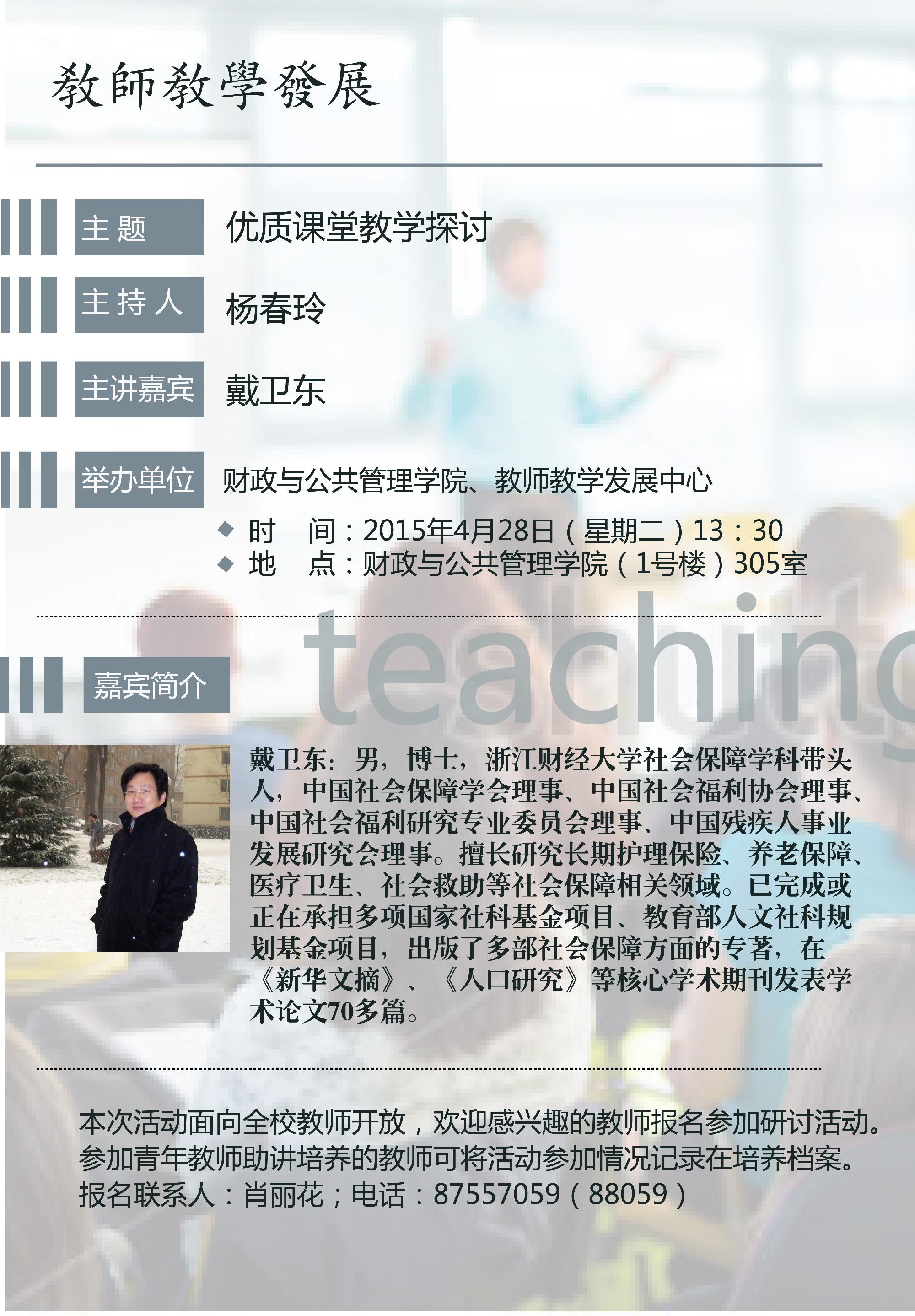 “教师教学发展”系列活动预告——优质课堂教学探讨 发布时间:2015-04-24点击量:次 上一条:“教学研讨沙龙”活动预告(2015年第7期) 下一条:“教师教学发展”系列活动预告——访学(留学)回国教师教学经验交流