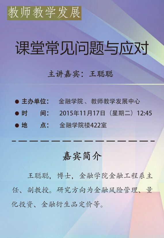 “教师教学发展”系列活动预告——课堂常见问题与应对 发布时间:2015-11-12点击量:次 本次活动面向全校教师开放,欢迎感兴趣的教师报名参加研讨活动。参加青年教师助讲培养的教师可将活动参加情况记录在培养档案。 报名联系人:肖丽花;电话:87557059(88059) 上一条:“教师教学发展”系列活动预告——教学论文写作的经验交流与分享 下一条:“教师教学发展”系列活动预告——课程考核的中美比较