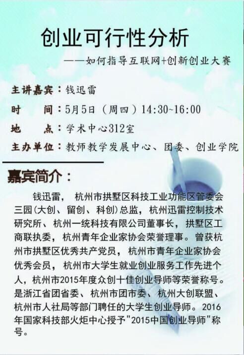 “创业可行性分析——如何指导互联网+创新创业大赛”讲座预告 发布时间:2016-05-04点击量:次 本次活动面向全校教师开放,欢迎感兴趣的教师报名参加。参加青年教师助讲培养的教师可将活动参加情况记录在培养档案。 报名链接:http://jwcold.zufe.edu.cn/soft/baoming/index.asp?eventid=201607 报名联系人:肖丽花;电话:87557059(88059) 上一条:ued体育 第九届青年教师教学技能竞赛决赛观摩预告 下一条:“教师教学发展”系列活动预告——规划设计专业教学经验交流暨专业十年实践教学成果展