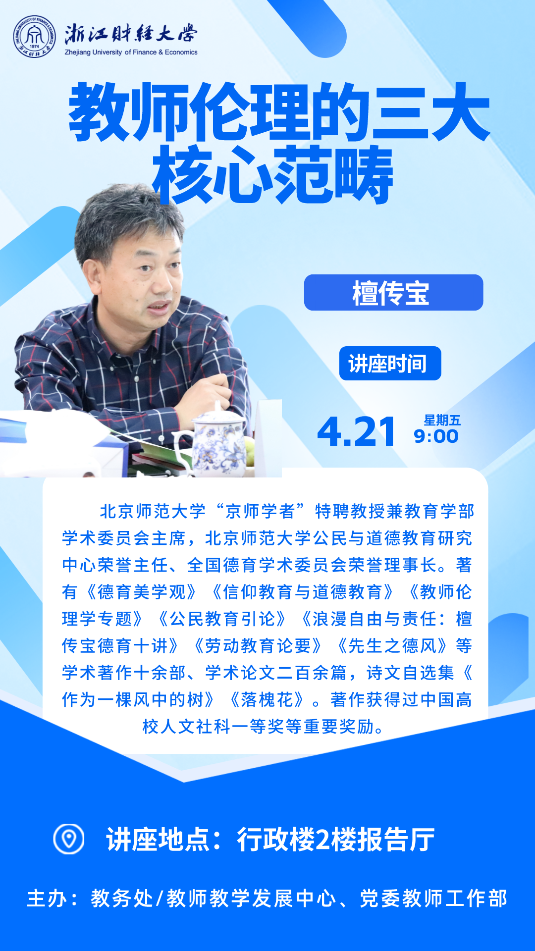 教发活动预告(十九):《教师伦理的三大核心范畴》 发布时间:2023-04-10点击量:次 ued体育 教务处、教师教学发展中心联合党委教师工作部本期邀请了北京师范大学“京师学者”檀传宝教授为青年教师及校院两级教学督导作“教师伦理核心范畴”主题讲座,希望广大教师积极参加。 上一条:教发活动预告——全球语境中的中文国际教学:机遇与挑战 下一条:教发活动预告(十八):《专业课教师课程思政的实施与评价》
