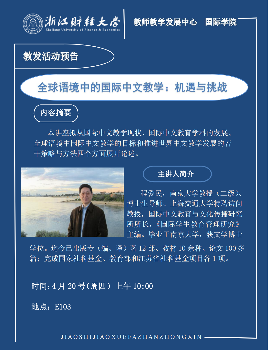 教发活动预告——全球语境中的中文国际教学:机遇与挑战 发布时间:2023-04-18点击量:次 上一条:教发活动预告(二十一):《督导视角下的大学课堂教学》 下一条:教发活动预告(十九):《教师伦理的三大核心范畴》