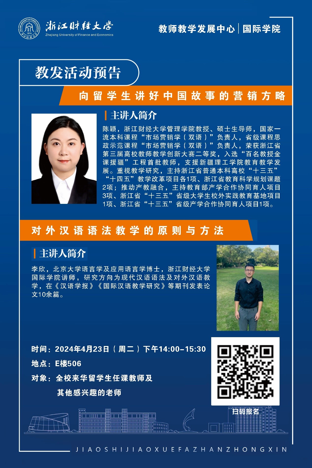 教发活动预告(三十一):向留学生讲好中国故事的营销方略 发布时间:2024-04-19点击量:次 上一条:名师大讲堂暨教务管理素养提升系列讲座 下一条:教发活动预告(三十):多元视角探索来华留学生能力培养路径 ——以《Accounting Principles》课程为例