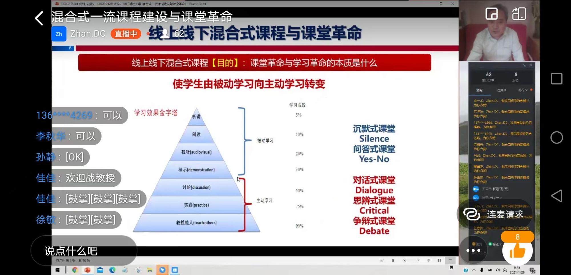 放假不放松,休息不休工。1月28日上午,学校教师教学发展中心邀请了哈尔滨工业大学二级教授、博士生导师,哈工大MOOC推进工作办公室主任战德臣教授作了一场题为“混合式一流课程建设与课堂革命”的专题讲座,吸引了全校近百名教师在线收看。