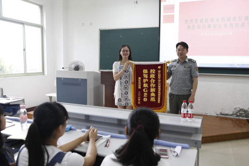 5月23日上午,杭州市西湖景区执法局局长冯刚代表景区城管执法局向我院赠送了锦旗,表达了对我院人才培养工作的感谢,并对G20期间作出优秀表现和突出贡献的2015级同学们给予了高度评价。党委书记沈晓敏代表学院接收锦旗,并感谢其为我院学生所提供的实习实训的锻炼机会。