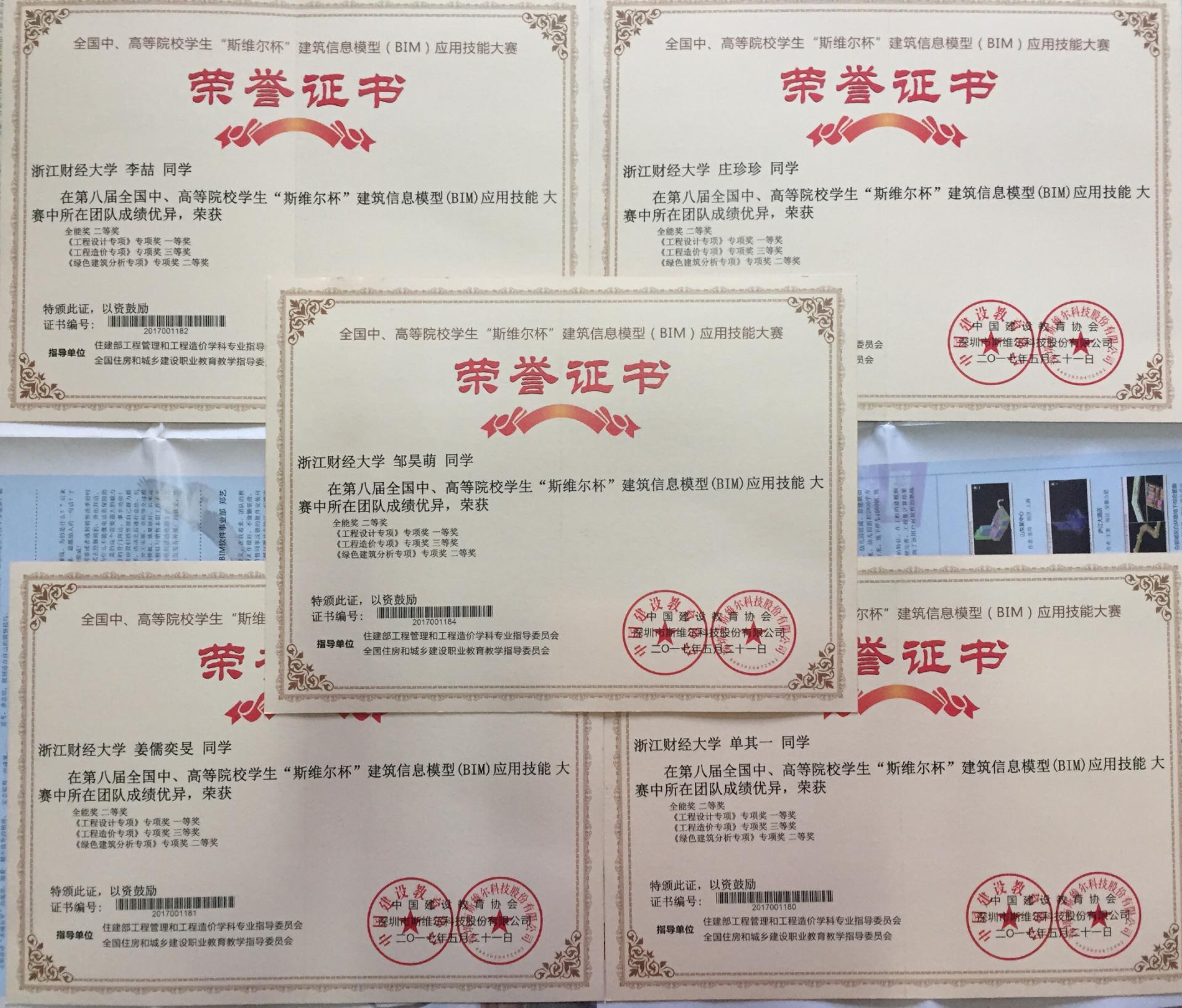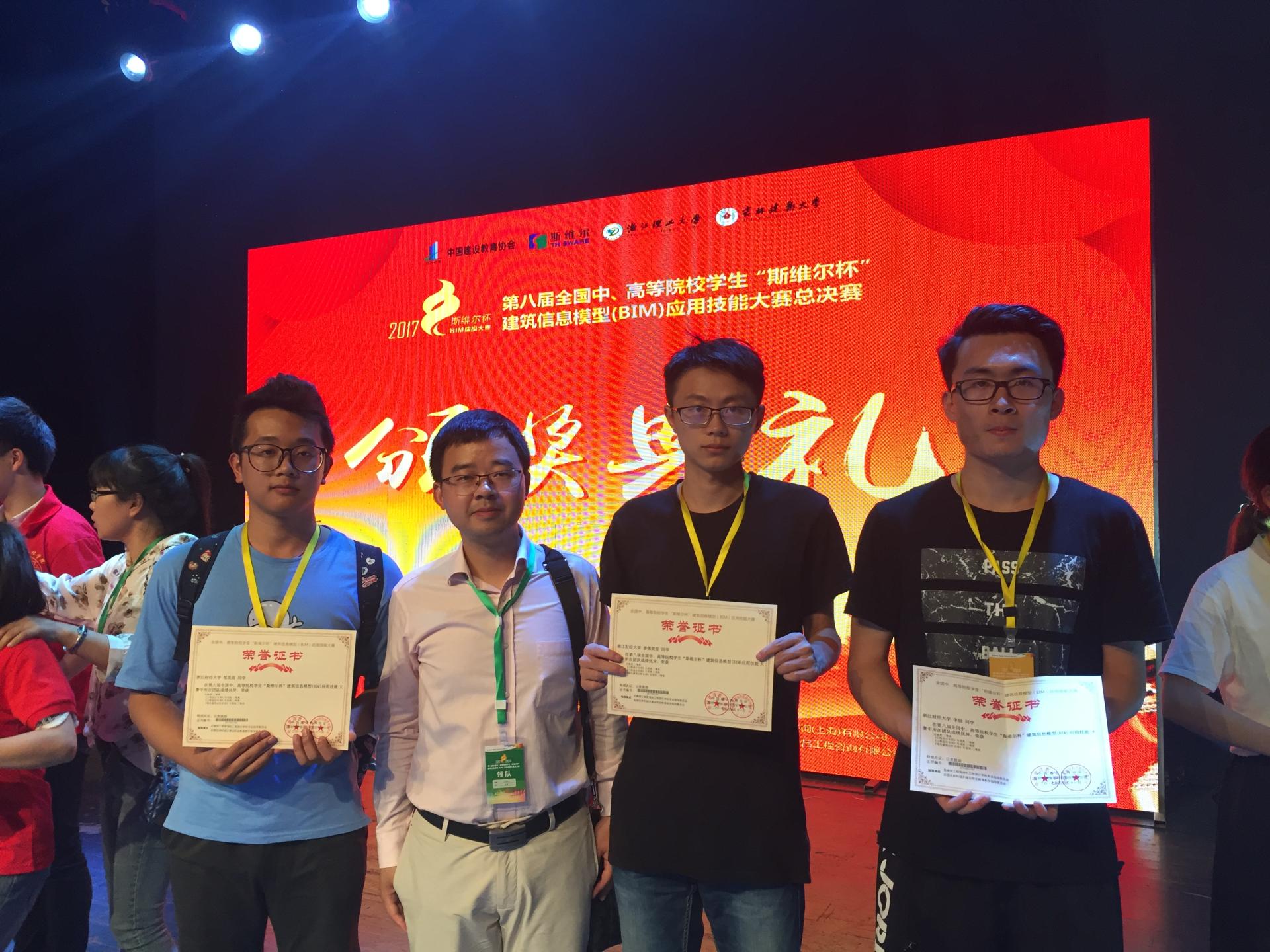 5月20日,我院14级工程管理专业邹昊萌、姜儒奕旻和15级工程管理专业李喆、庄珍珍、单其一同学组队参加了第八届全国中、高等院校学生“斯维尔杯”建筑信息模型(BIM)应用技能大赛决赛。来自浙江大学、重庆大学、四川大学等327所本科院校、126所高职院校,共457支代表队,近2300人参赛。经过一整天的激烈角逐,最终荣获全能奖二等奖、工程设计专项一等奖、绿色建筑分析专项二等奖和工程造价专项三等奖。该比赛由工程管理系彭毅老师作为指导教师和带队教师。