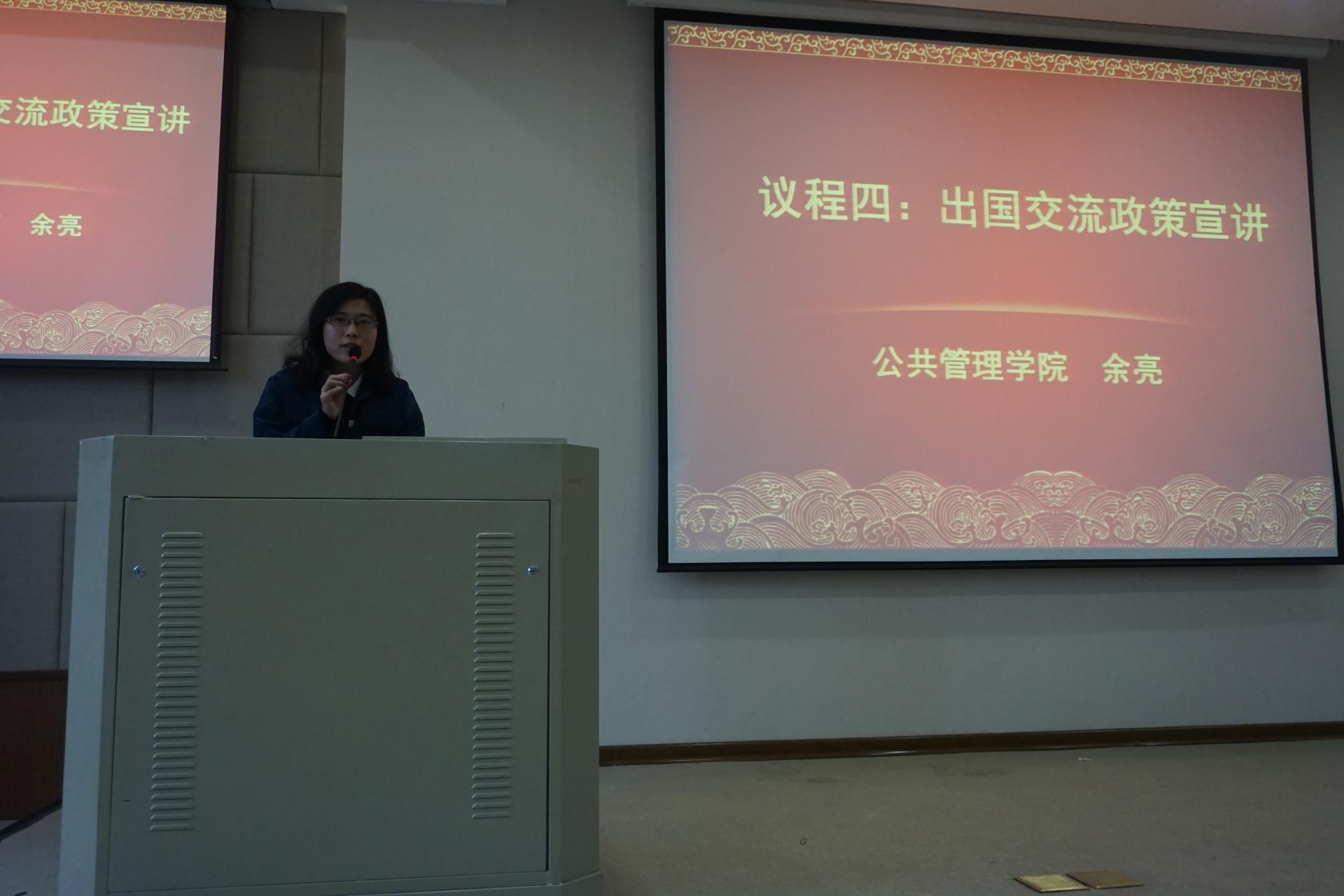 学办主任杨文超老师、团委书记余亮老师分别从校院鼓励支持角度对2015级学生考研、出国作了动员,就相关奖励政策作了解读,通报了前两届毕业生考研出国情况,号召同学们勇于挑战自己,合理安排生涯规划,并祝愿大家取得好成绩。