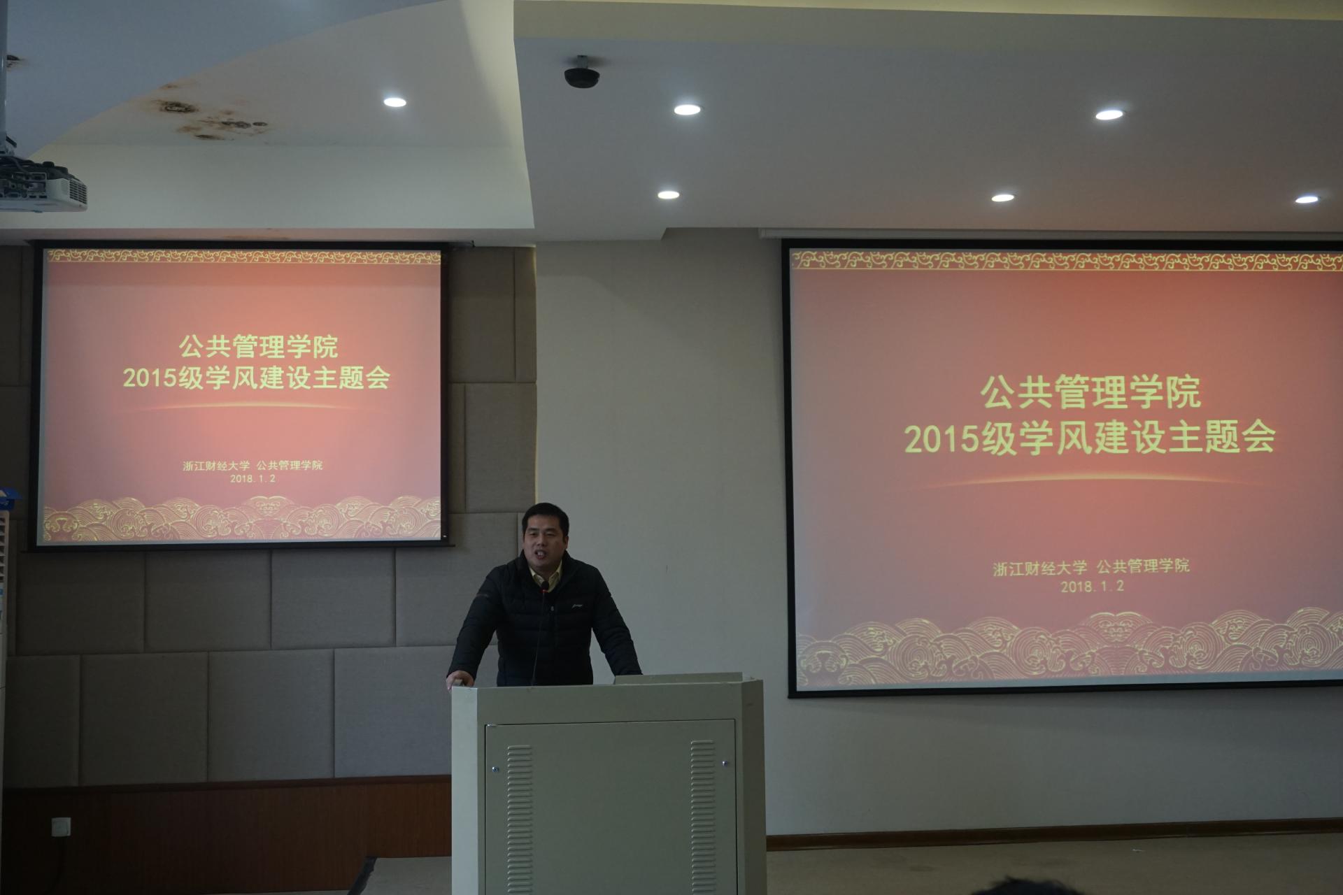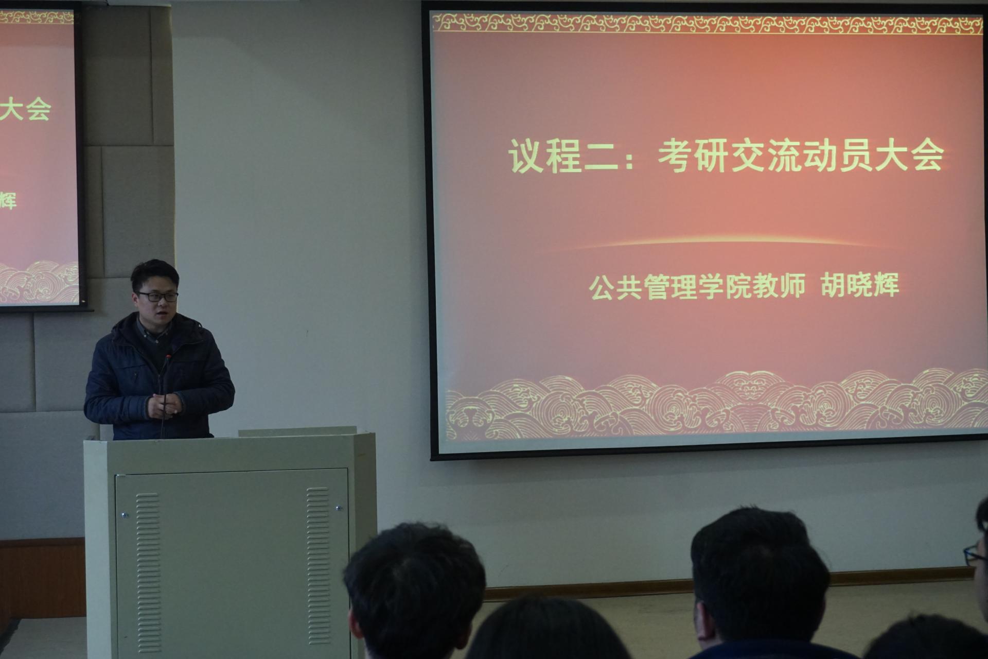 1月2日下午,公共管理学院“追梦在公管”年级大会(2015级)在学院楼208报告厅隆重召开。院党委副书记程晓东及学办、团委负责人、2015级全体学生参加本次年级大会。为深入推进学生考研出国深造,会议邀请了金融学院团委书记蒋超老师及我院“三考中心”负责人胡晓辉作专题辅导。会议由学办主任杨文超老师主持。