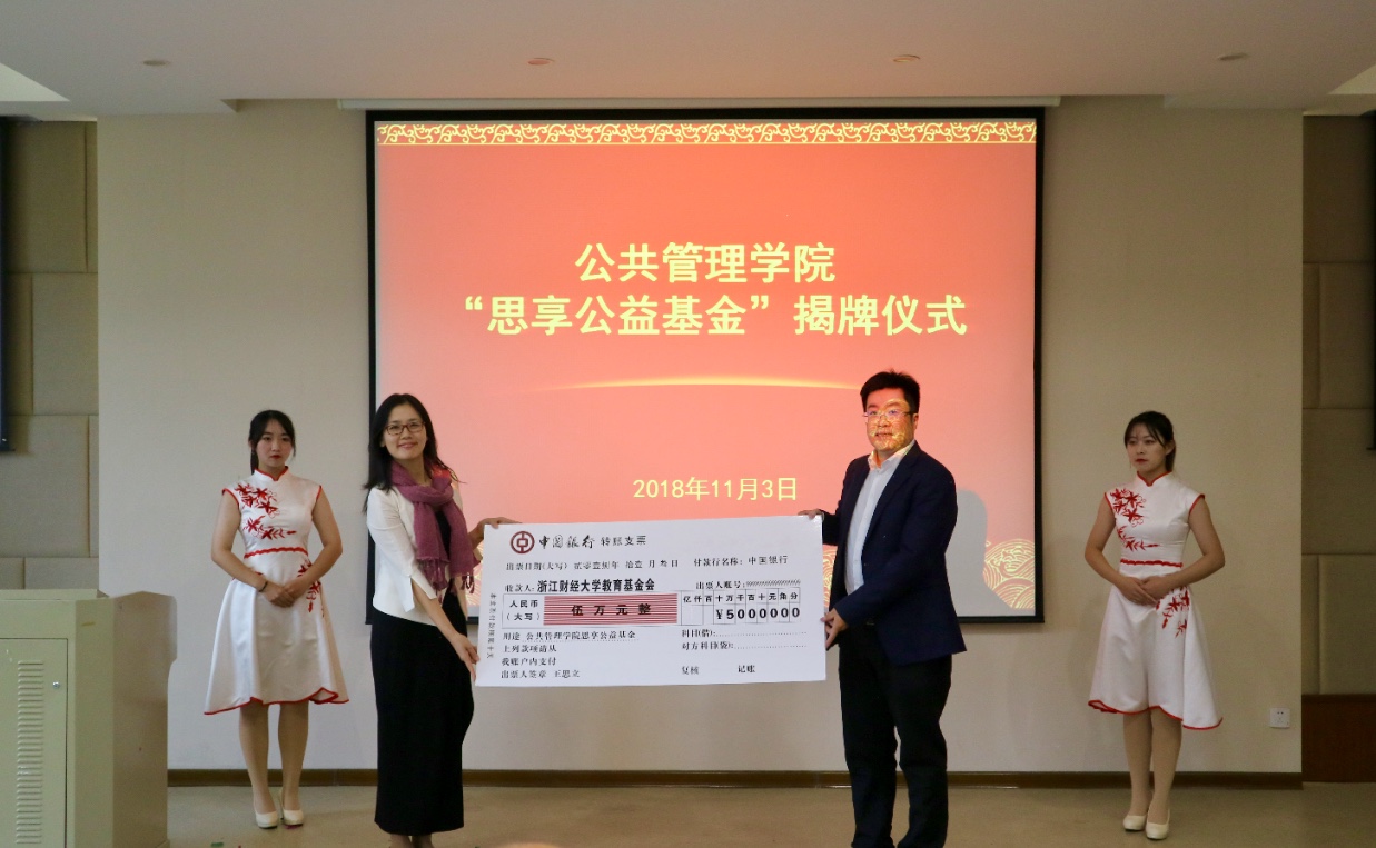 仪式上,郭剑鸣院长与王思立校友共同为“思享公益基金”揭牌,沈晓敏书记上台接受捐赠,标志着该基金正式挂牌成立。相信在广大校友的关心支持下,在校公管学子们一定会再接再厉,乘势前进,开创更加灿烂辉煌的明天。