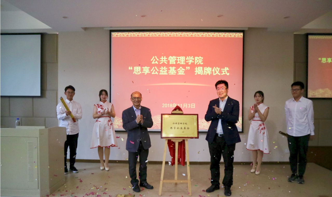 活动第二阶段举行的是公共管理学院“思享公益基金”揭牌仪式。“思享公益基金”由王思立校友牵头捐赠5万元发起成立,主要用于在校公管学子帮扶、优秀学生奖励、创新创业资助等,体现了我院校友感恩母院培养,心系学院发展的优秀品质和情怀。