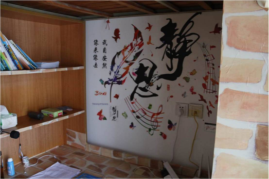 选材上以简单的色调相称,这简单而又富有内涵颜色总体上表达了我们1#647寝室人乐于交友,待人热情;渴望上进,积极进取;热爱大自然以及孜孜不倦的求学态度与热情。个性的书桌则寓意我们热爱蓝天,渴望自由。没有过多复杂的装饰,可以在个性中增添适当的挂饰,在整体整洁的基调下自由发挥,在白色的墙壁上贴上各自喜欢的墙纸构建属于自己的温馨小窝,展示各人风格。也给纯白加上了一点激情的色彩,进门的左右装饰体现了作为大学生的我们的创意,玛丽莲梦露的照片给疲惫的我们重新注入力量,而左边的墙贴给寝室增添了几分艺术气息。
