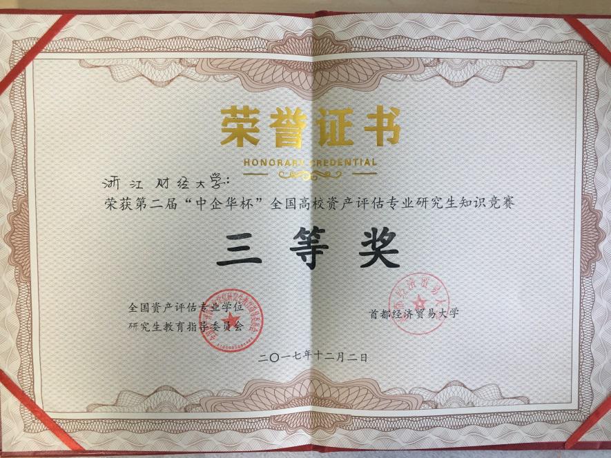 2017年12月2日,第二届“中企华杯”全国高校资产评估研究生专业知识竞赛在首都经济贸易大学琢玉讲堂落下帷幕。我校代表队谢殊莹、梁佳楣、孙如松、陈拓在郭化林教授的带领下在26支参赛队伍中脱颖而出,总分排名第四,喜获三等奖,郭化林教授获得优秀指导教师奖。
