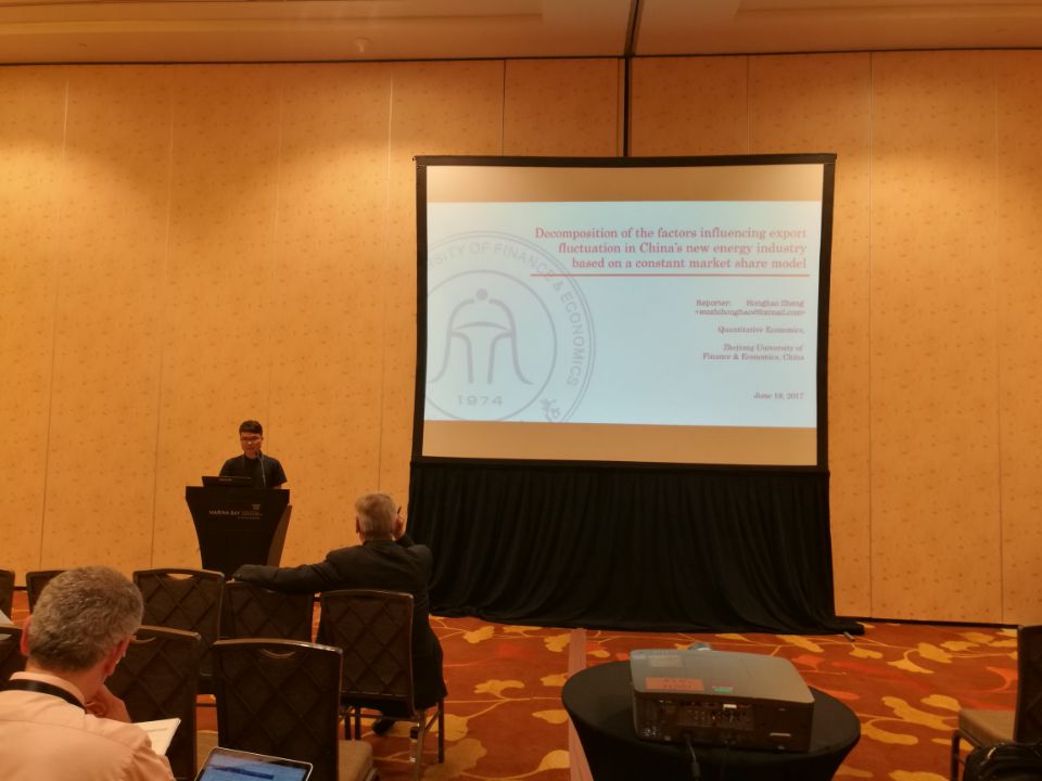 会议分为主题演讲和口头报告环节,来自中国、美国、英国、新加坡、韩国、日本、印度、澳大利亚、巴西等数十个国家和地区的专家学者在会上围绕“Meeting the Energy Demands of Emerging Economies”、“Implications for Energy and Environmental Markets”等相关议题展开了深入的探讨与交流。郑弘浩同学在会上报告了其与导师合作完成的学术论文“Decomposition of the factors influencing export fluctuation in China’s new energy industry based on a constant market share model”(已被SCI/SSCI一区国际期刊Energy Policy接受),就我国新能源产业出口波动影响因素的分解问题与与会专家学者展开了深入的讨论和交流。