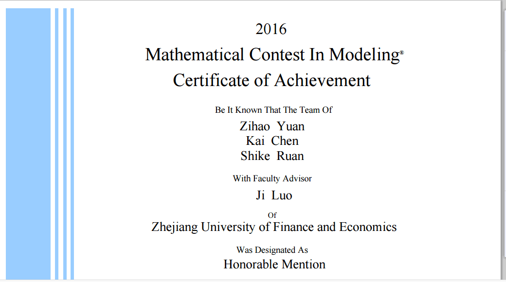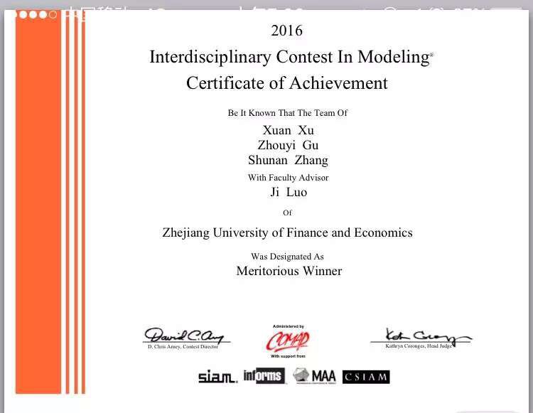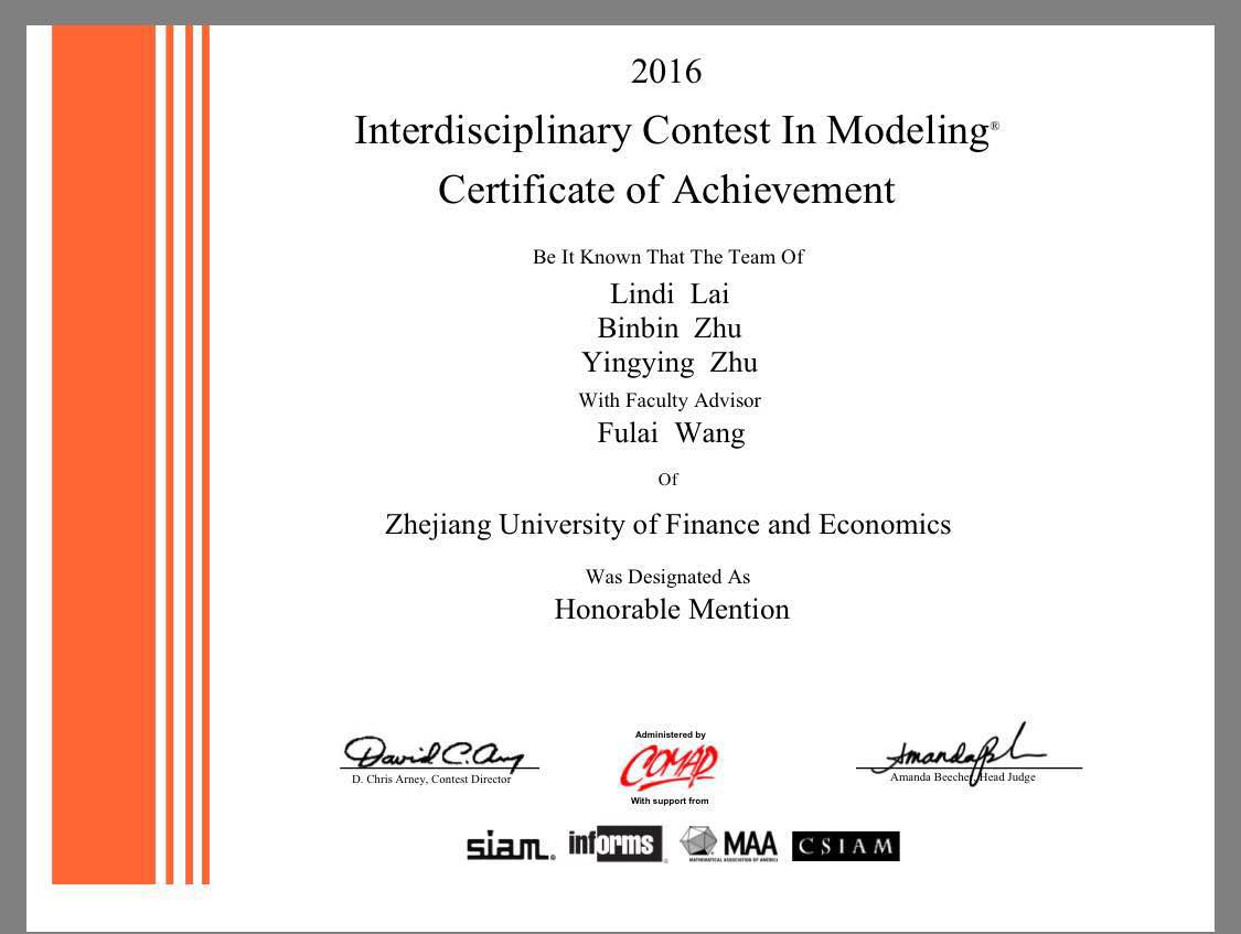 近日,2016年美国大学生数学建模竞赛结果揭晓,我校6名参赛研究生全部获奖,获得1项一等奖、2项二等奖,创历史最佳成绩。他们是2014级的徐璇、顾洲一,和2015级张淑楠获一等奖, 另外3名2015级研究生朱颖颖、赖林娣和袁梓皓分别与本科生组队参赛获得两项二等奖。