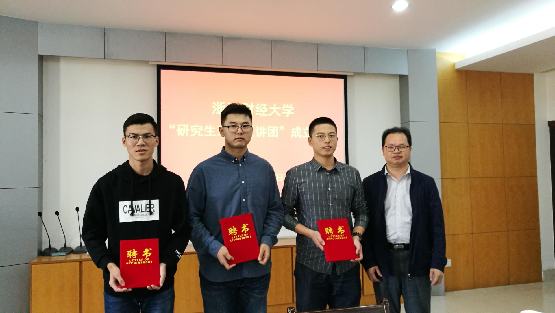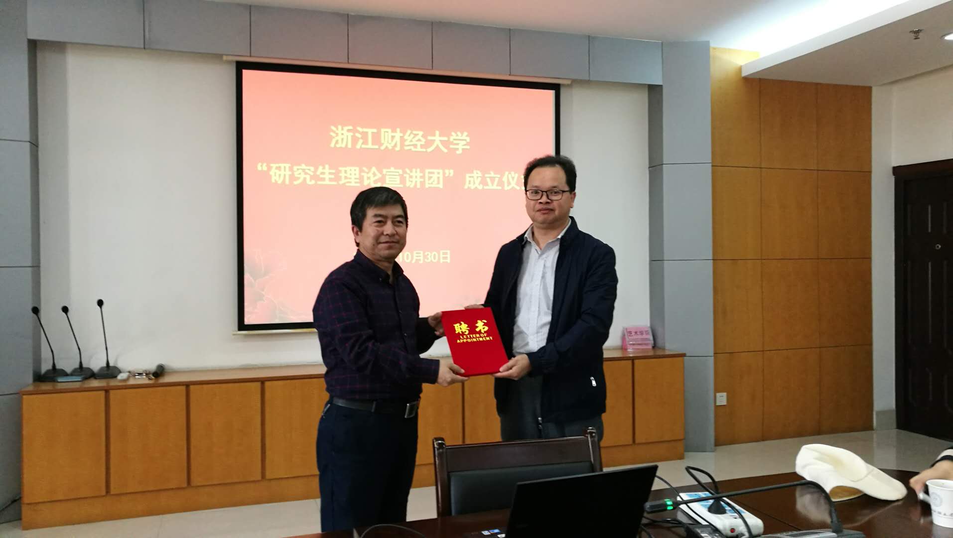 成立仪式后,“研究生理论宣讲团”指导老师华正学为宣讲团成员做了主题为“如何让理论宣讲充满青春气息”的专题辅导,从理论宣讲的要求、内容和特色等方面出发,对如何做好理论宣讲工作进行了较为系统的阐述。他指出,浙财研究生的理论宣讲,要有理论的高度、实践的温度和老百姓关注的热度,更要有浙财特色,希望宣讲团成员能不断充实自己,充分利用专业优势,努力把宣讲团打造成浙财研究生的“新名片”。