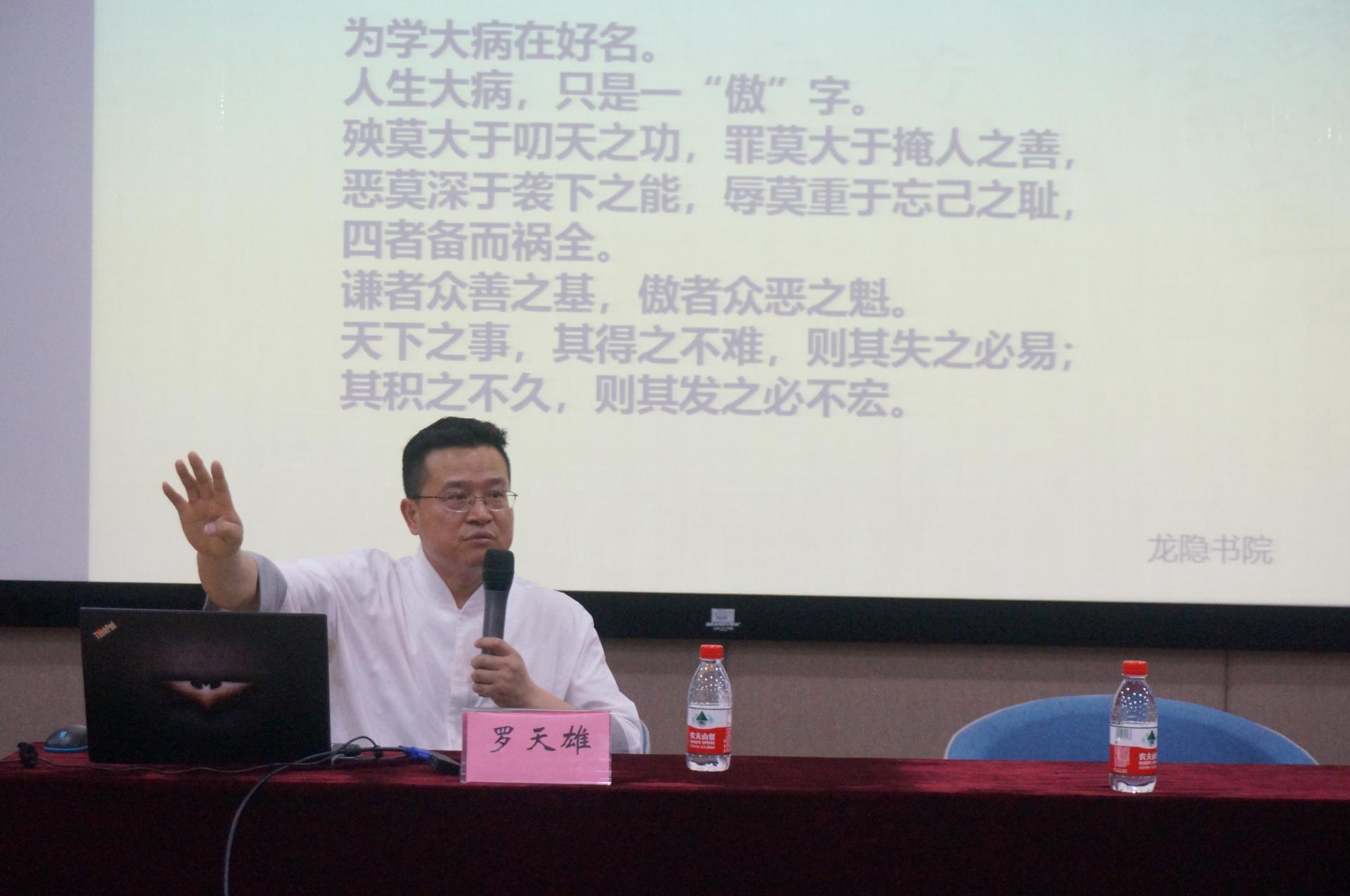 5月22日下午,研究生“博文大讲堂”第十讲在图书馆六楼多功能报告厅举行。龙隐书院院长、华夏道商德润体系创建人罗天雄先生应邀以“突破心境实现卓越人生”为主题,作了关于王阳明心学智慧的专题讲座,100多名师生到场聆听。