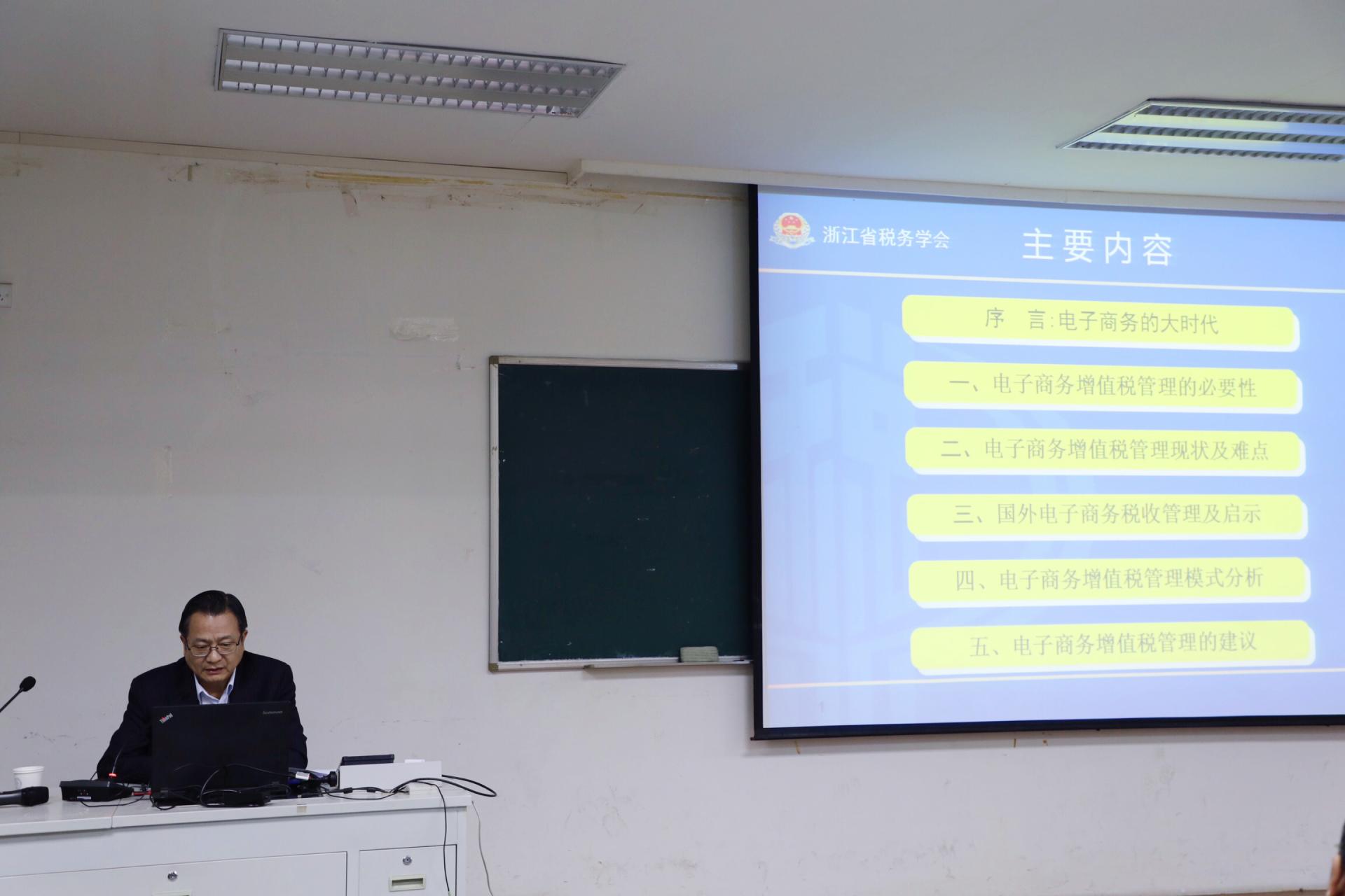 2018年10月25日(周四)下午,ued体育 财政税务学院邀请浙江省国家税务局原局长、浙江省税务学会会长、我校兼职教授周广仁博士为我院部分师生奉献了主题为《中国电子商务增值税管理问题研究》的精彩讲座,此次活动为学校系列“基地精英进课堂”活动之一。