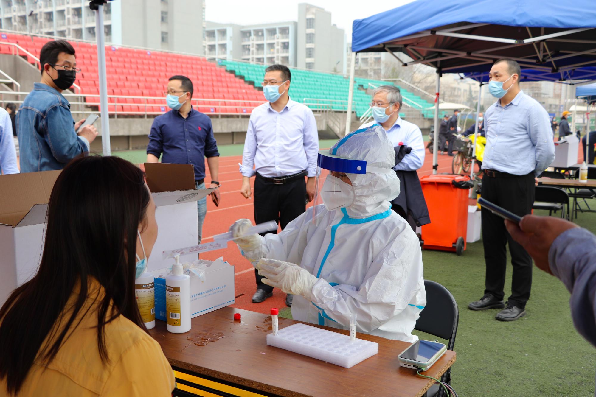 根据疫情防控原则和精神,为维护师生生命健康,当天下午,学校迅速组织开展全员核酸检测,在下沙校区田径场设立核酸检测点,分批分次,应检尽检。校党委书记李金昌,党委副书记、校长钟晓敏等先后来到现场检查指导工作。在全校各部门、学院的精心安排,学生志愿者的有序引导和全体师生的大力配合下,18000余人快速有序完成了防护性核酸检测。