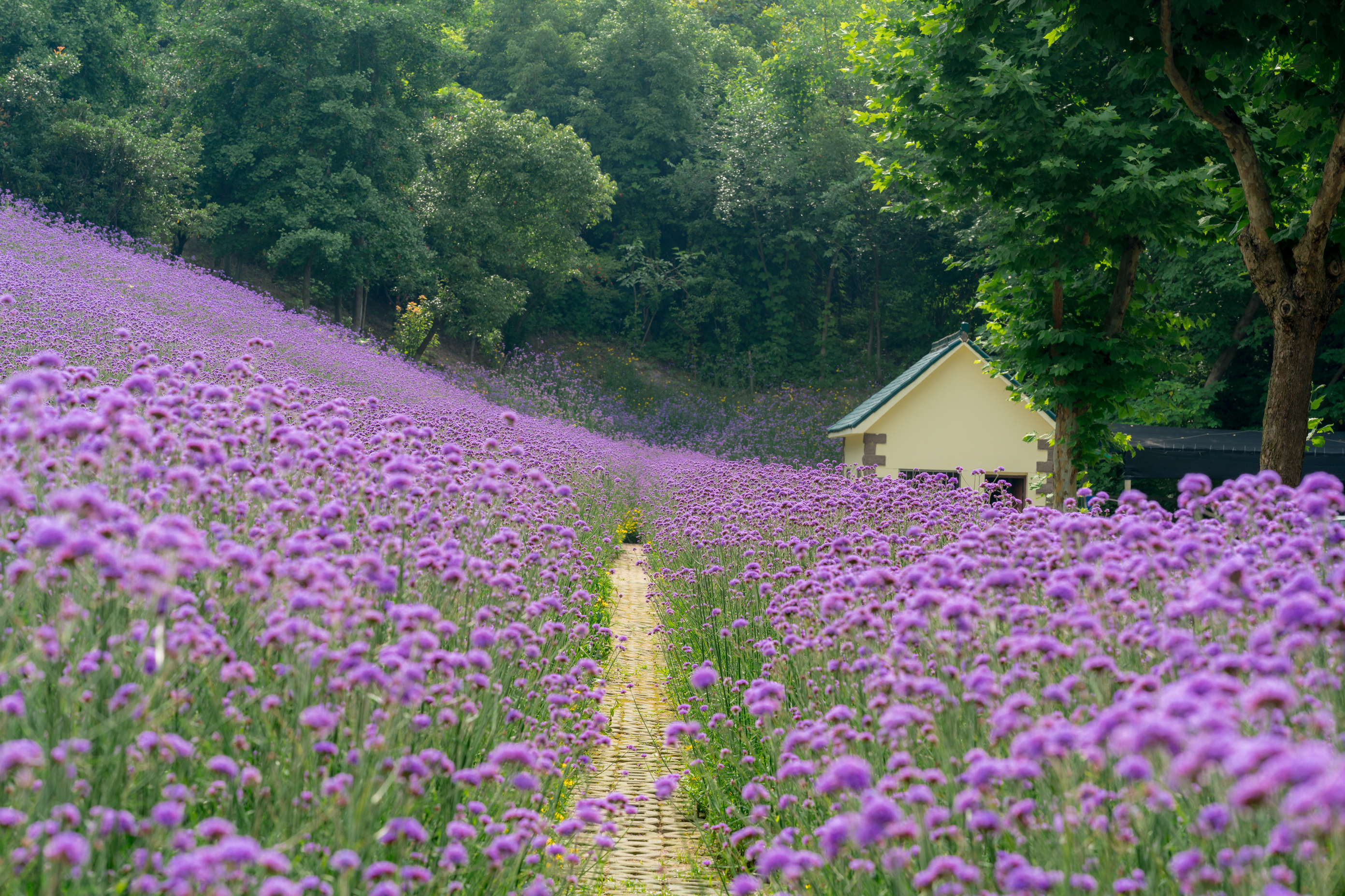 而北边的校门旁,那片紫色的马鞭草花海,更是令人心醉神迷。马鞭草的花朵细小而密集,仿佛一片紫色的绒毯铺展在我们面前,让人仿佛置身于一个浪漫的童话世界。花香四溢,微风轻拂,漫步其中,感受到的是无尽的宁静与美好。