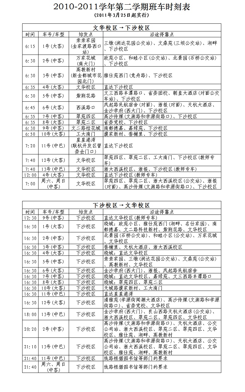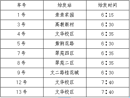 1、取消华润超市站点(文华至下沙为8号车,下沙至文华为12号车),请原华润超市上车老师就近选择上下车站点(建议至省委党校站上下车)。