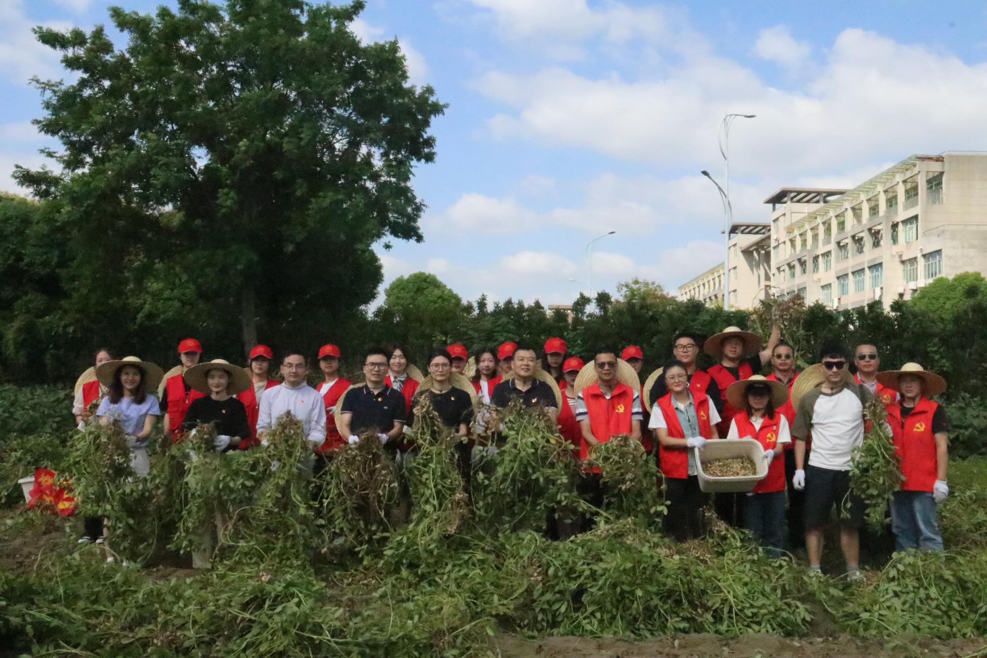 两个支部30多位师生党员在田间地头挥洒汗水,共同劳动。大家两两一组,松土拔根和摘花生密切配合,大家撸起袖子,弯下腰身,脚步轻盈地穿梭在田间。不一会儿筐中的花生就成了堆。