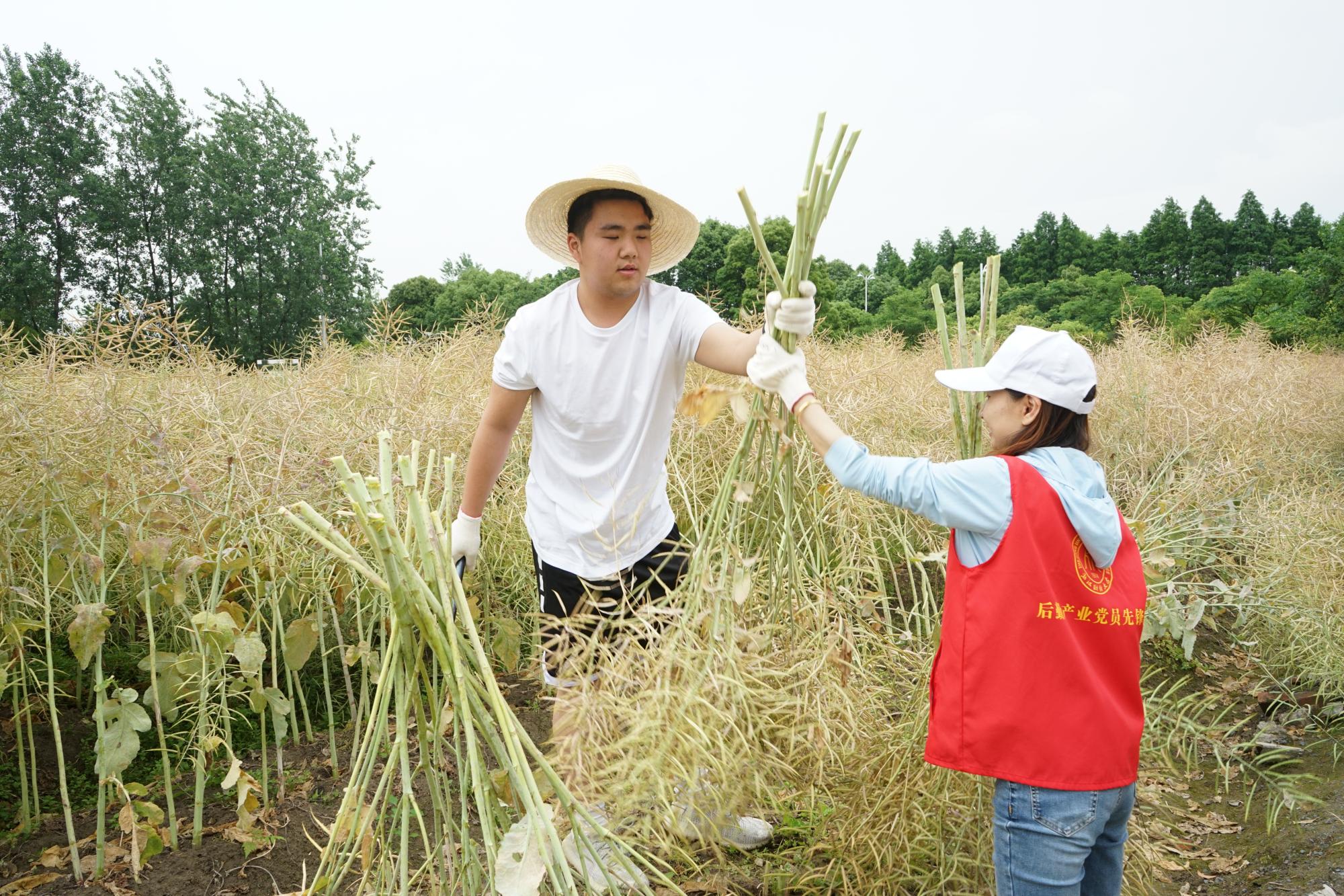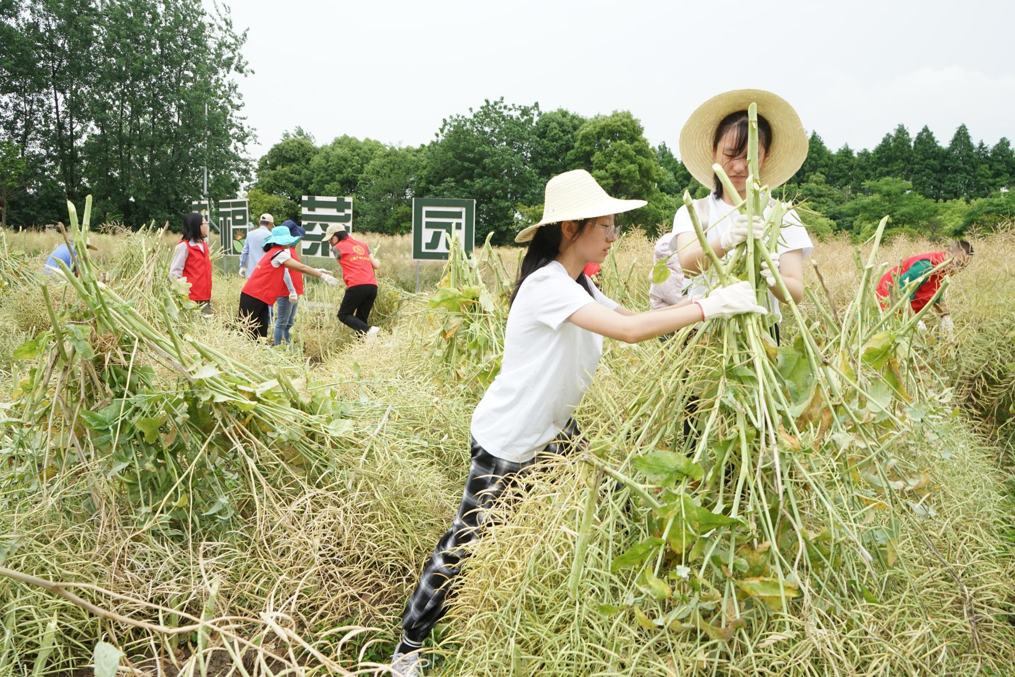5月11日上午,后勤产业党总支青年党员先锋队携手学生走入幸福菜园,开展“践行初心 助力育人”油菜收割主题党日活动。