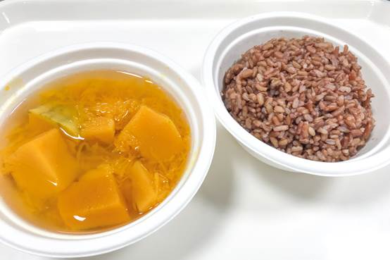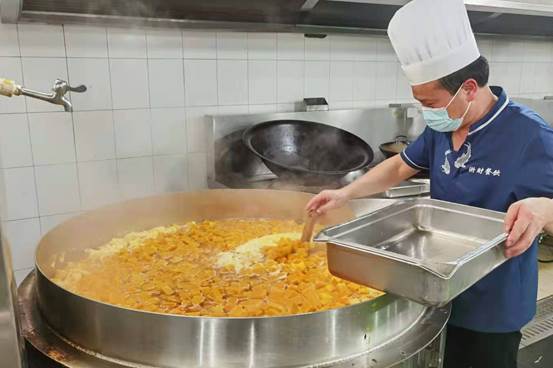 活动一早,餐饮部便提前完成了红米蒸制,并将切好的南瓜放入大锅熬制南瓜汤。为了尽可能还原革命年代不易,让红色历史更具体验感,红米饭和南瓜汤在加工工程中均未进行过多调味处理,尽可能让食材保持贴近红军长征时的口感和口味,引导广大师生在粗糙餐食中忆苦思甜、感念党恩。