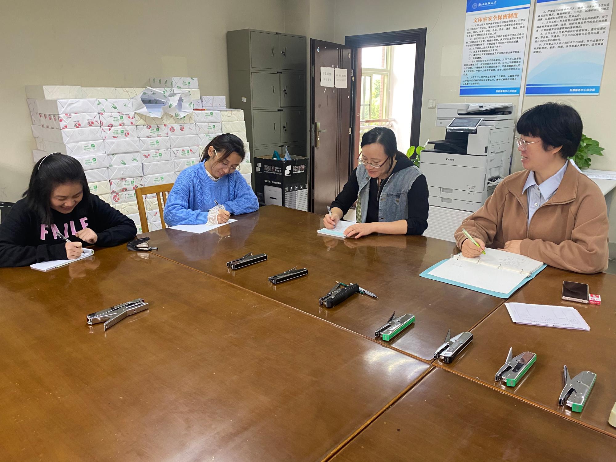 临近期中,为进一步规范文印管理,提升业务水平,文印室开展了内部人员技能培训与交流。培训中,王晨燕细致讲解了文件排版的流程和格式,并分享了日常工作中需要注意的细节。暨晓玮着重分析了文件复印操作和试卷印制过程中容易出错的几个要点,并重申了保密要求。全体与会人员认真学习,并开展了业务上的深入沟通交流。