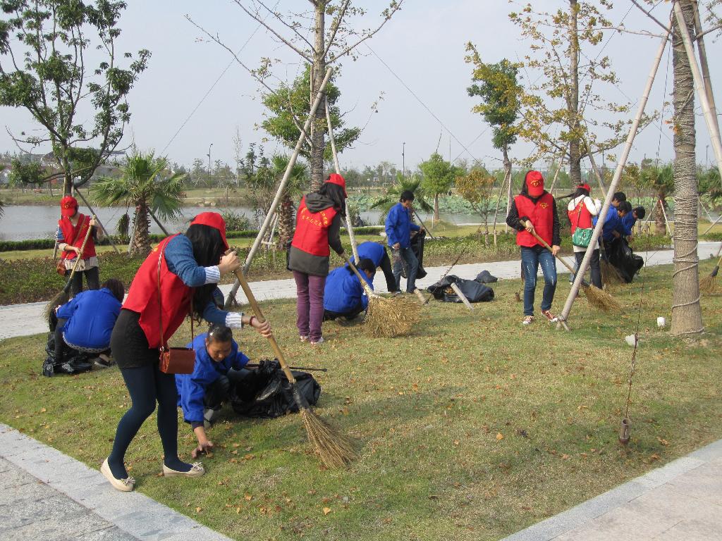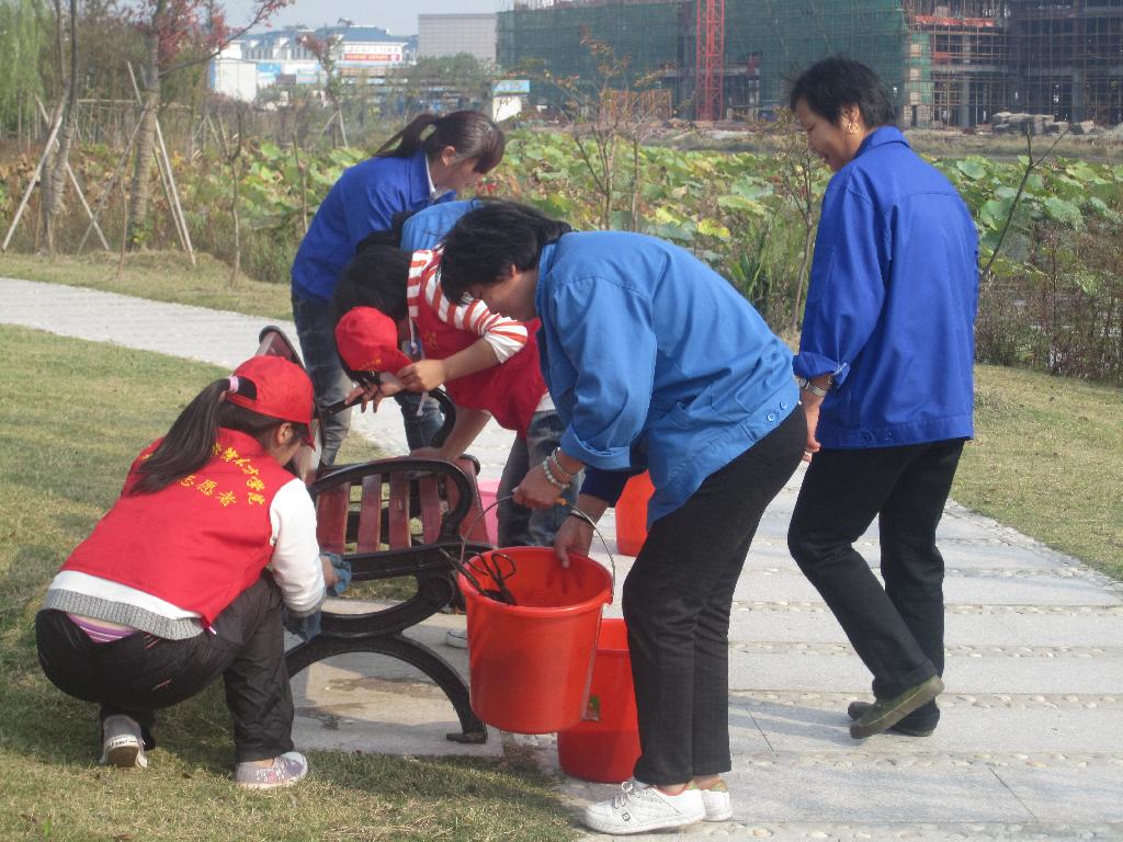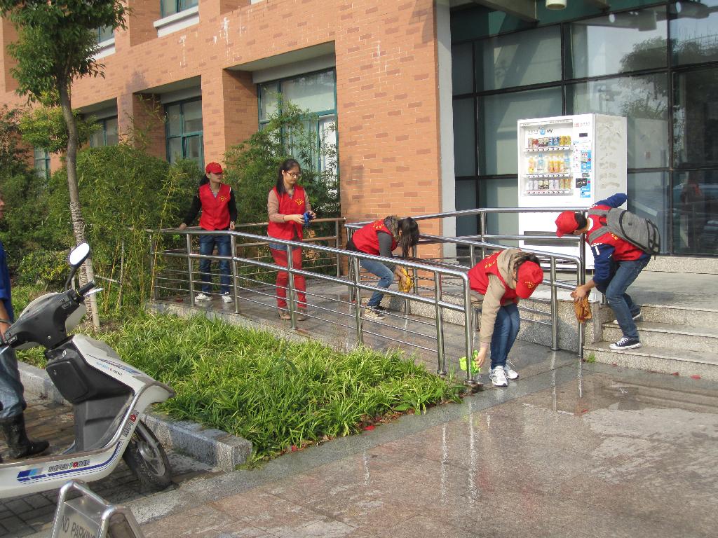 活动当天,物管部管理员叶伟民简单作了活动内容介绍及清扫任务安排,并将保洁人员与25名学生志愿者分成三组,第一组由保洁员朱如芬的带领,负责清扫景行湖南面草坪上的树叶;第二组由保洁组长蔡守华带领,负责擦洗景行湖边的休闲椅、清理景行湖草坪内的垃圾;第三组由管理员叶伟民带领,负责清洗教学区域内各楼宇门前的残疾人通道及扶手。分工结束后,保洁人员及青年志愿者们都带好各自的清扫工具,迅速地投入到了“战斗”中:你提水,我擦椅;你捡垃圾,我撑袋;你扫树叶,我来运。宁静的校园,秋风就像顽皮的孩子,时不时过来捣乱,青年志愿者们刚扫到一起还来不及畚起来的树叶,又被吹散了,保洁员与同学们就索性蹲在地上用手捧树叶,远远望去,景行湖边跳动着蓝色、红色的“精灵”,相互呼应,给瑟瑟的秋天增添了一丝活力。
