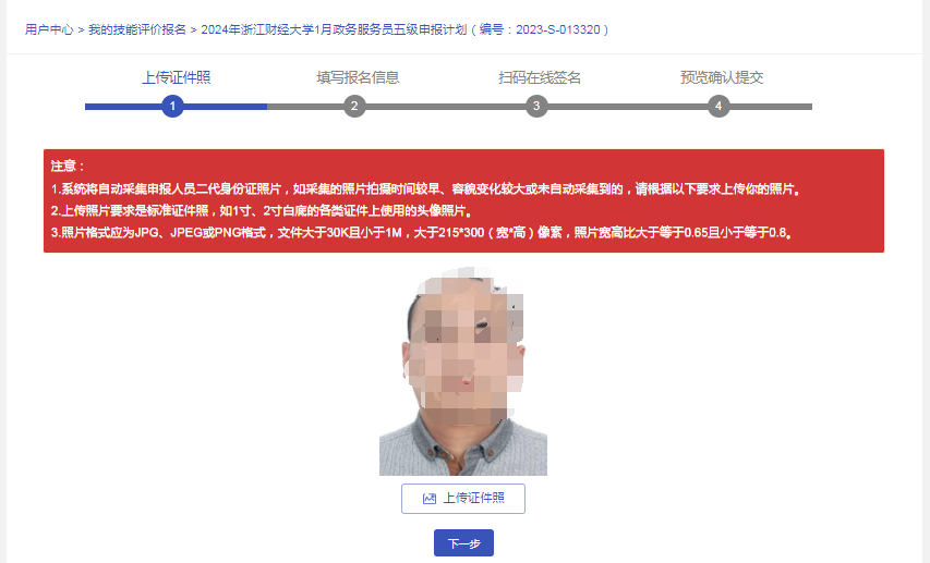注:系统会自动采集申报人员的二代身份证照片;如果没有自动采集成功,请考生上传本人证件照,证件照需要满足界面红色区域中的第2和第3点要求。