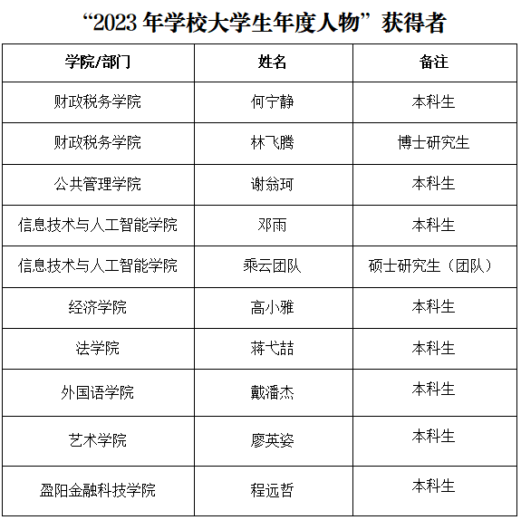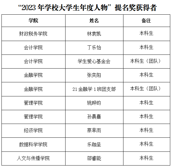 大学生年度人物评审通过材料评审的方式进行,40位候选个人和团队在自强不息、见义勇为、诚信友善、孝老敬亲、志愿公益、学术科研、创新创业、社会实践、文艺体育等方面表现突出,充分展示了财大学子昂扬向上的精神风貌。最终,何宁静等9位同学、乘云团队荣获2023年“大学生年度人物”荣誉称号,林袁凯等8位同学、学生爱心基金会等2支团队荣获“大学生年度人物”提名奖荣誉称号。