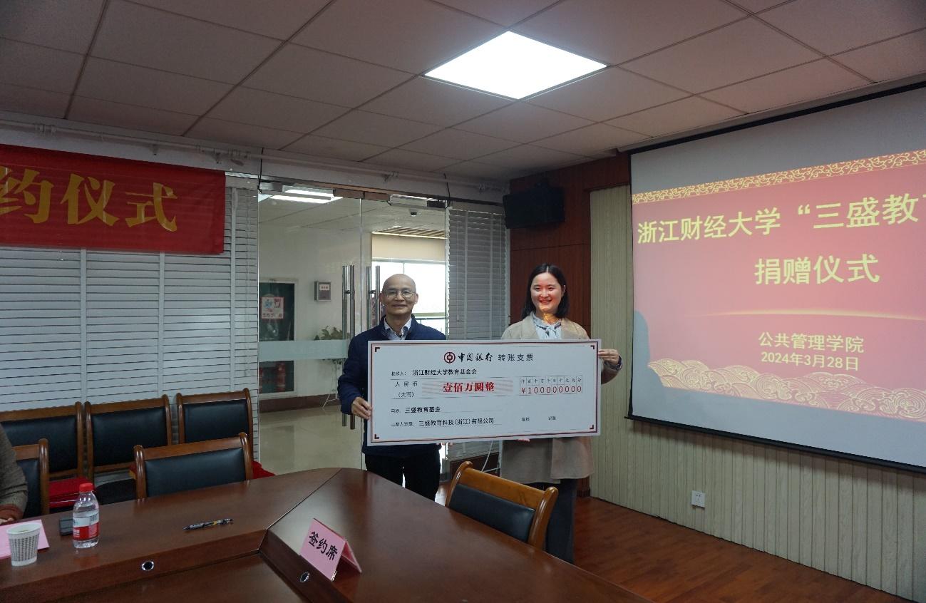 本网讯3月28日,“三盛教育基金”捐赠仪式在下沙校区举行。校党委副书记程爽、三盛教育科技有限公司总经理李达出席签约仪式。