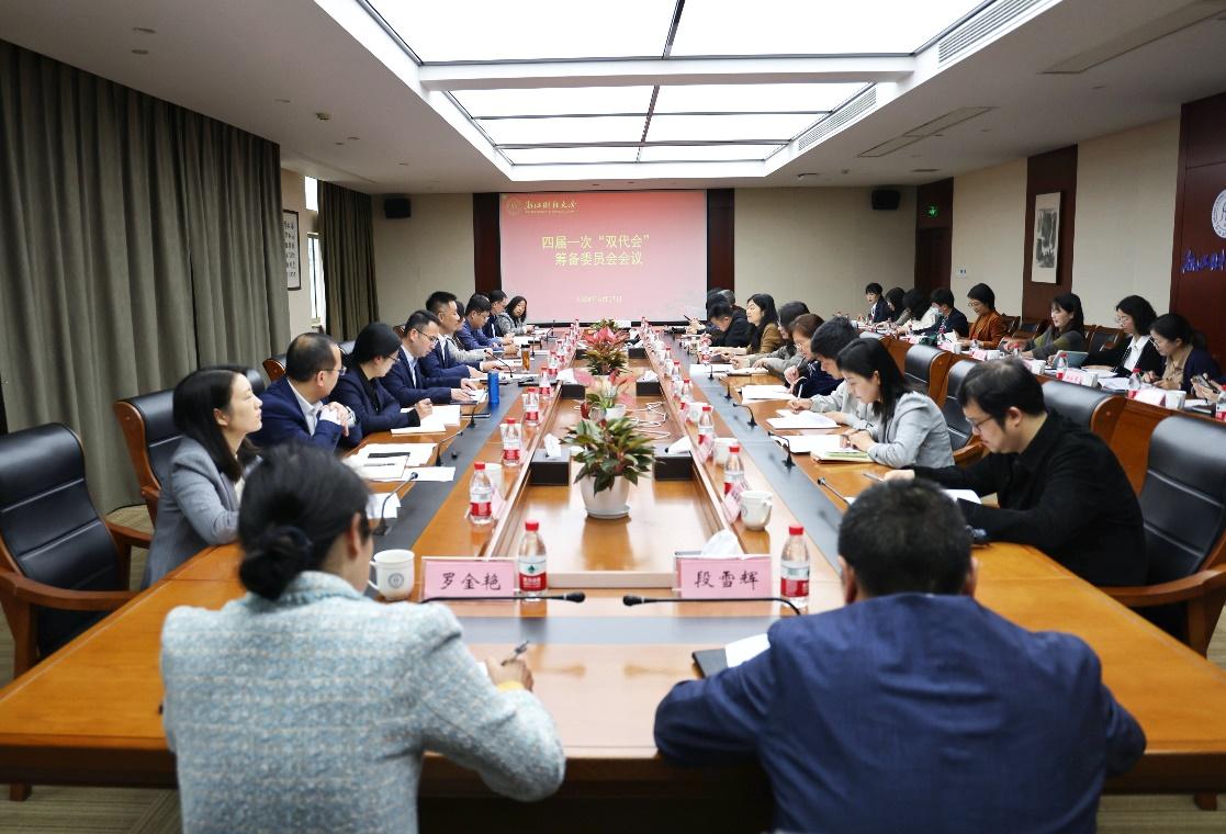 本网讯4月17日,学校召开四届一次“双代会”筹备委员会第一次会议。校党委副书记程爽,校党委委员、组织部统战部部长、东方学院党委书记申屠莉出席会议。
